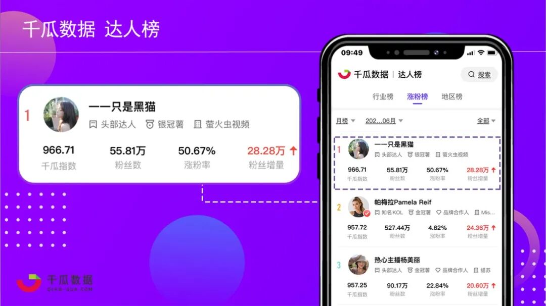 例如涨粉榜数据显示,头部达人一一只是黑猫6月涨粉增量为TOP1,涨粉率50.67%,粉丝增量为28.28万。