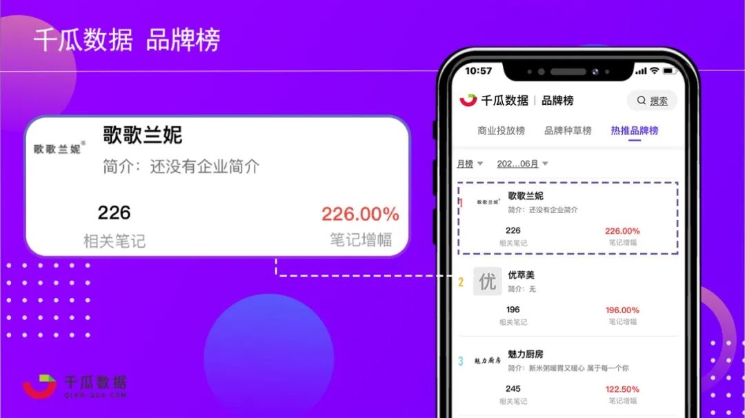 品牌榜分为商业投放榜、品牌种草榜、热推品牌榜三个内容,品牌可通过榜单来了解竞对以及竞品的声量。