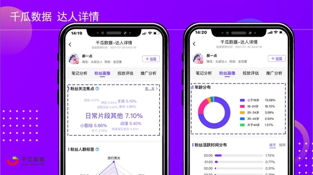 达人详情从笔记数据、粉丝画像、投放评估、推广分析几方面来体现达人情况,多维度数据透视。
