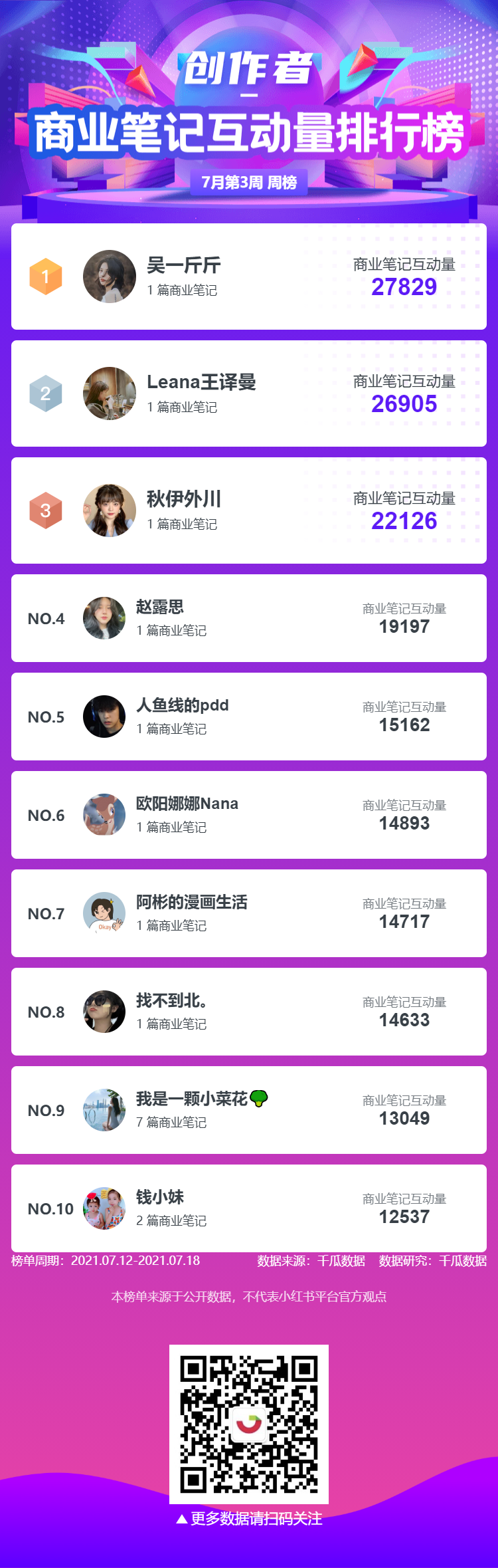创作者-商业笔记互动量排行榜中“吴一斤斤”排名第一,商业笔记互动量27829;“王译曼”排名第二,商业笔记互动量26905;“秋伊外川”排名第三,商业笔记互动量22126。