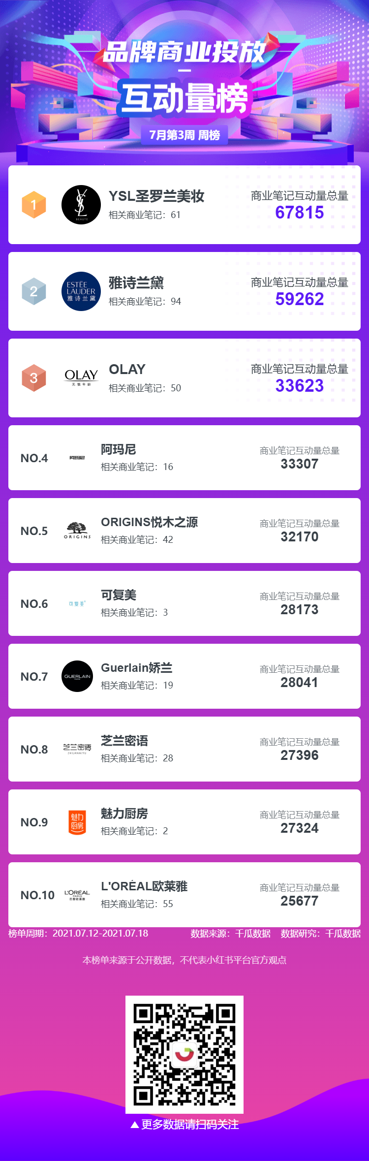 品牌商业投放-互动量榜中“圣罗兰”排名第一,商业笔记互动量总量67815;“雅诗兰黛”排名第二,商业笔记互动量总量59262;“OLAY”排名第三,商业笔记互动量总量33623。