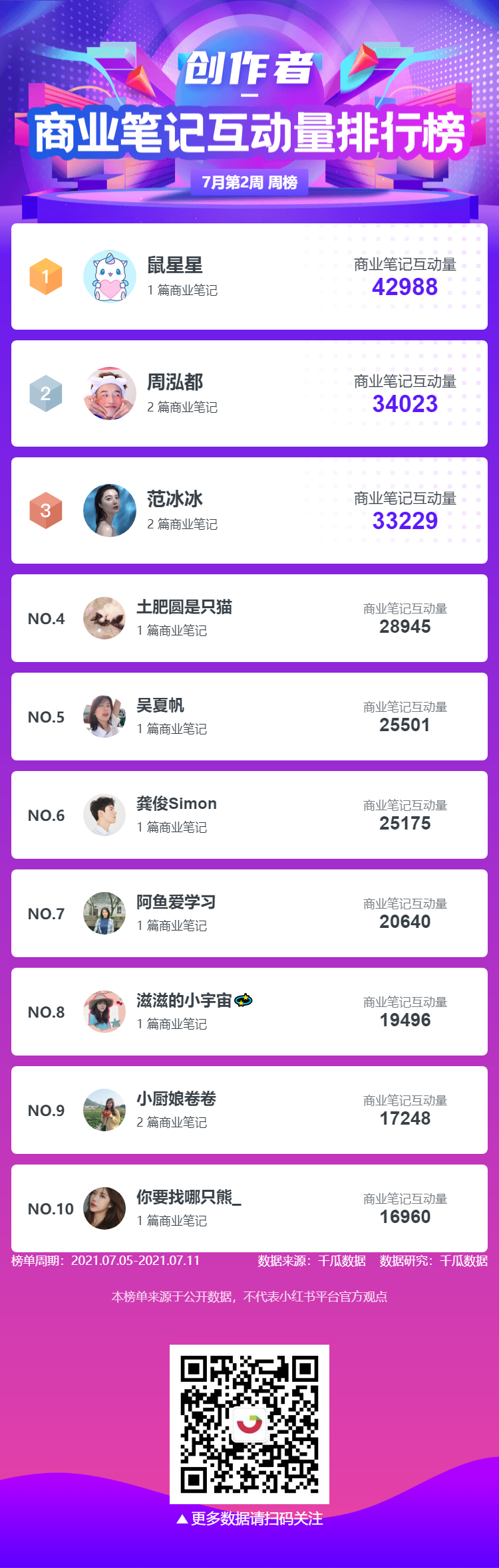 创作者-商业笔记互动量排行榜中“鼠星星”排名第一,商业笔记互动量42988;“周泓都”排名第二,商业笔记互动量34023;“范冰冰”排名第三,商业笔记互动量33229。