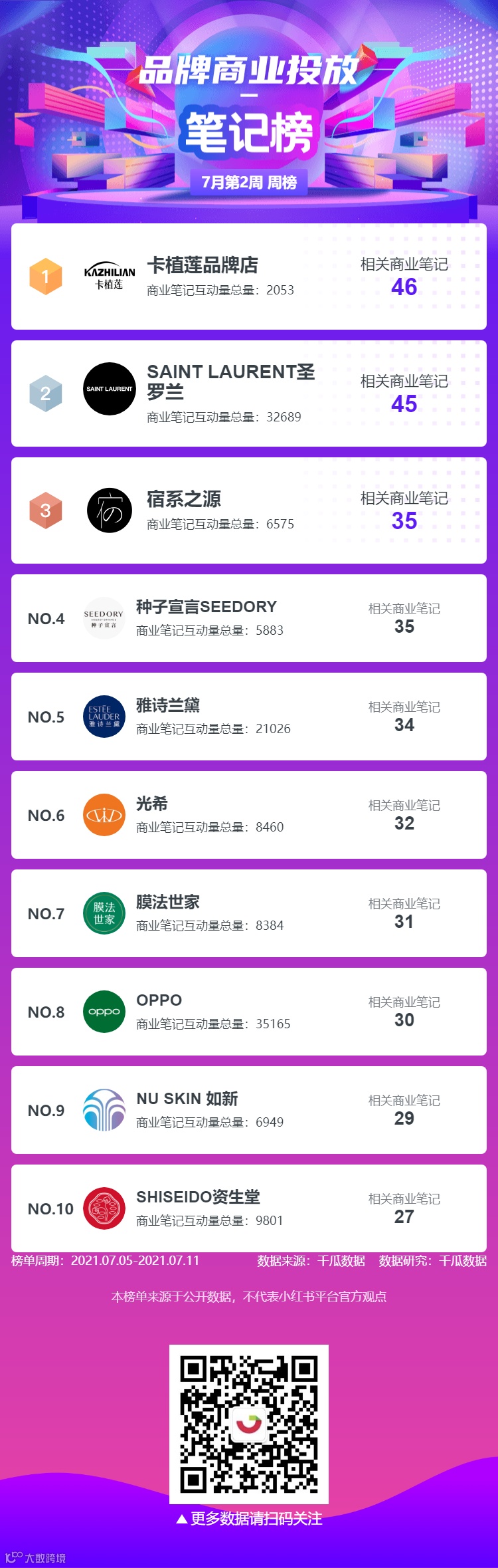 品牌商业投放榜-笔记榜中“卡植莲”排名第一,相关商业笔记46;“圣罗兰”排名第二,相关商业笔记45;“宿系之源”排名第三,相关商业笔记35。