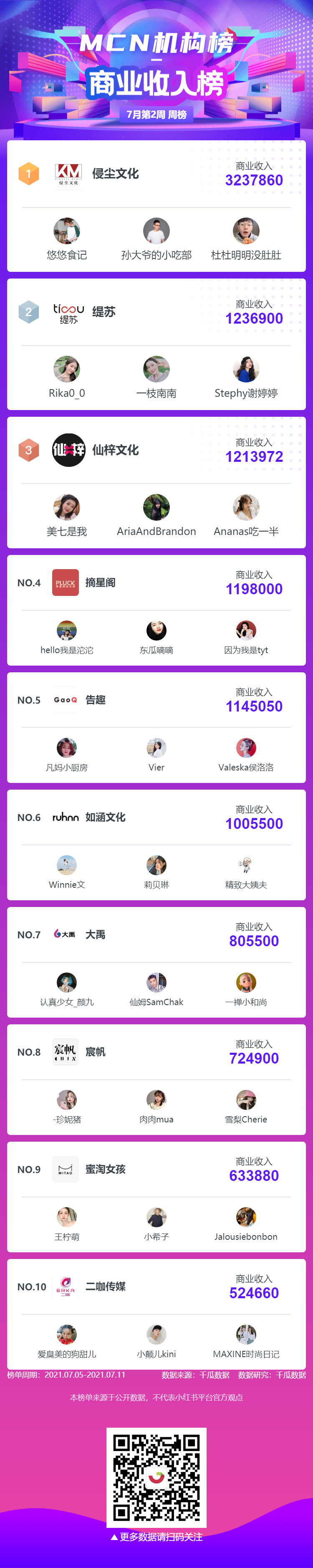 MCN机构榜-商业收入榜中“侵尘文化”排名第一,商业收入3237860;“缇苏”排名第二,商业收入1236900;“仙梓文化”排名第三,商业收入1213972。