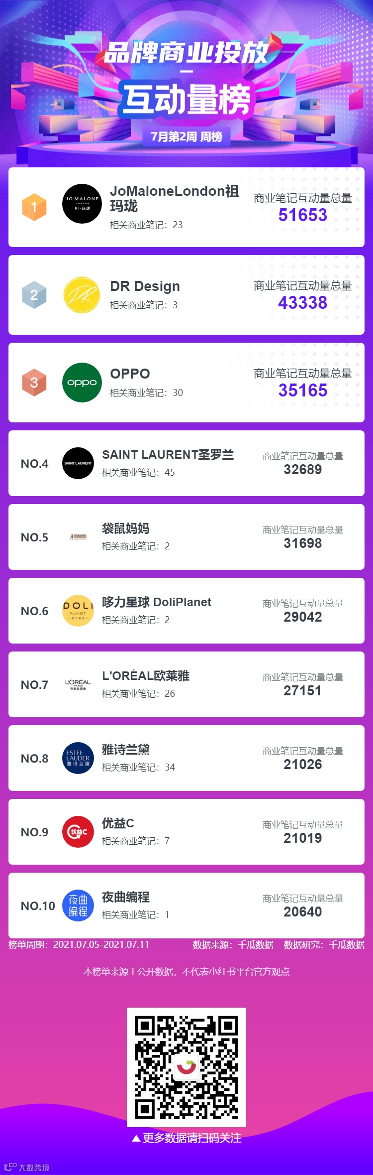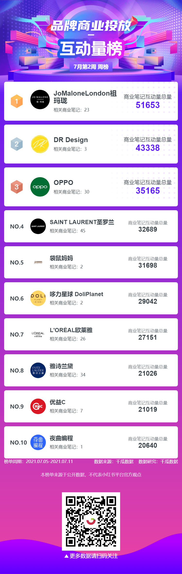 品牌商业投放-互动量榜中“祖玛珑”排名第一,商业笔记互动量总量51653;“DR Design”排名第二,商业笔记互动量总量43338;“OPPO”排名第三,商业笔记互动量总量35165。