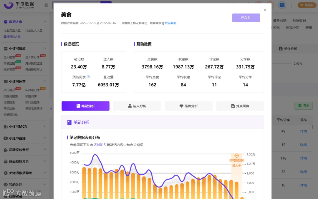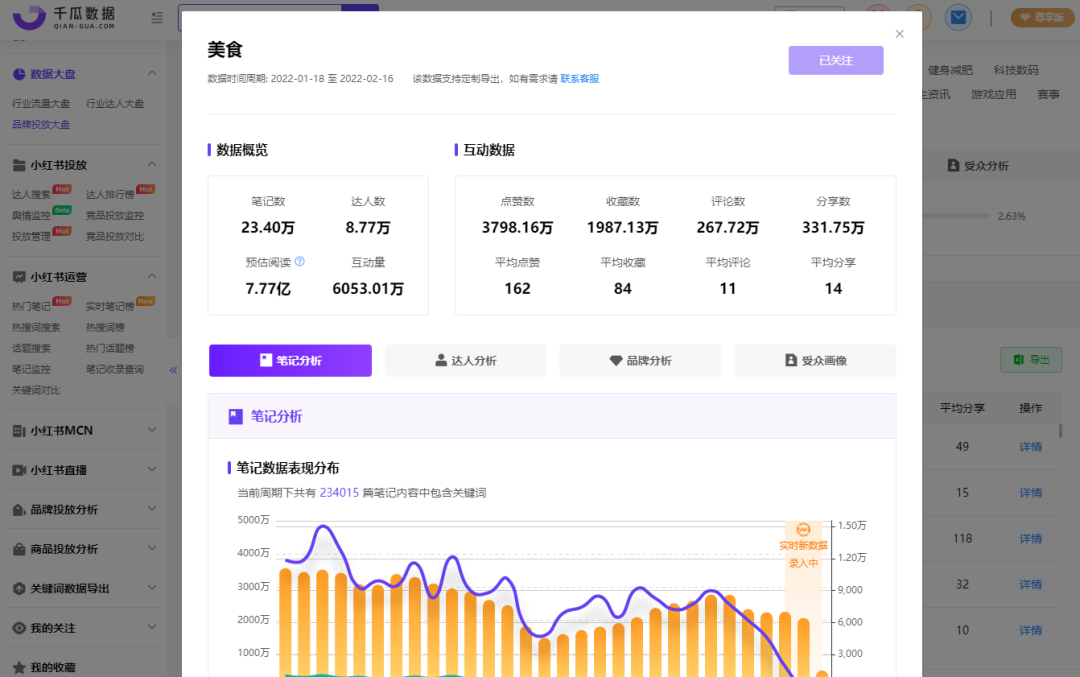 千瓜数据显示,内容关键词“美食”的笔记篇数为23.49万,达人数为8.75万,互动量为6041.36万。