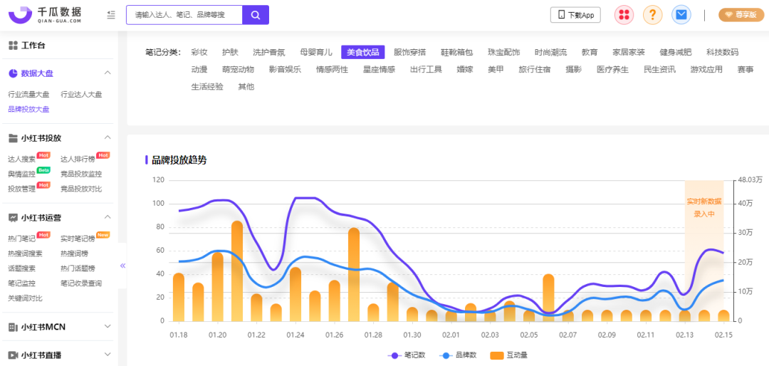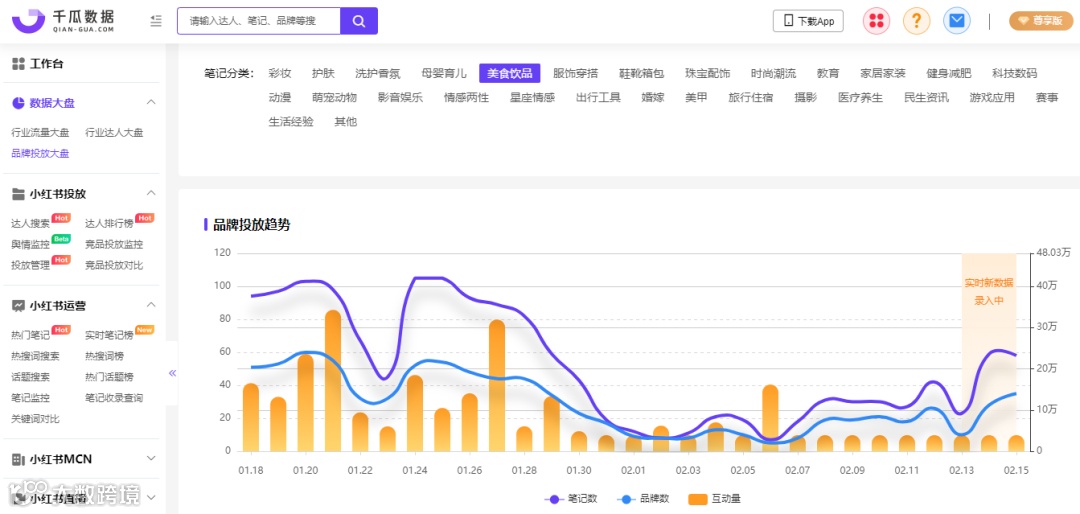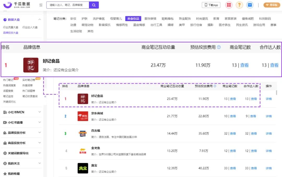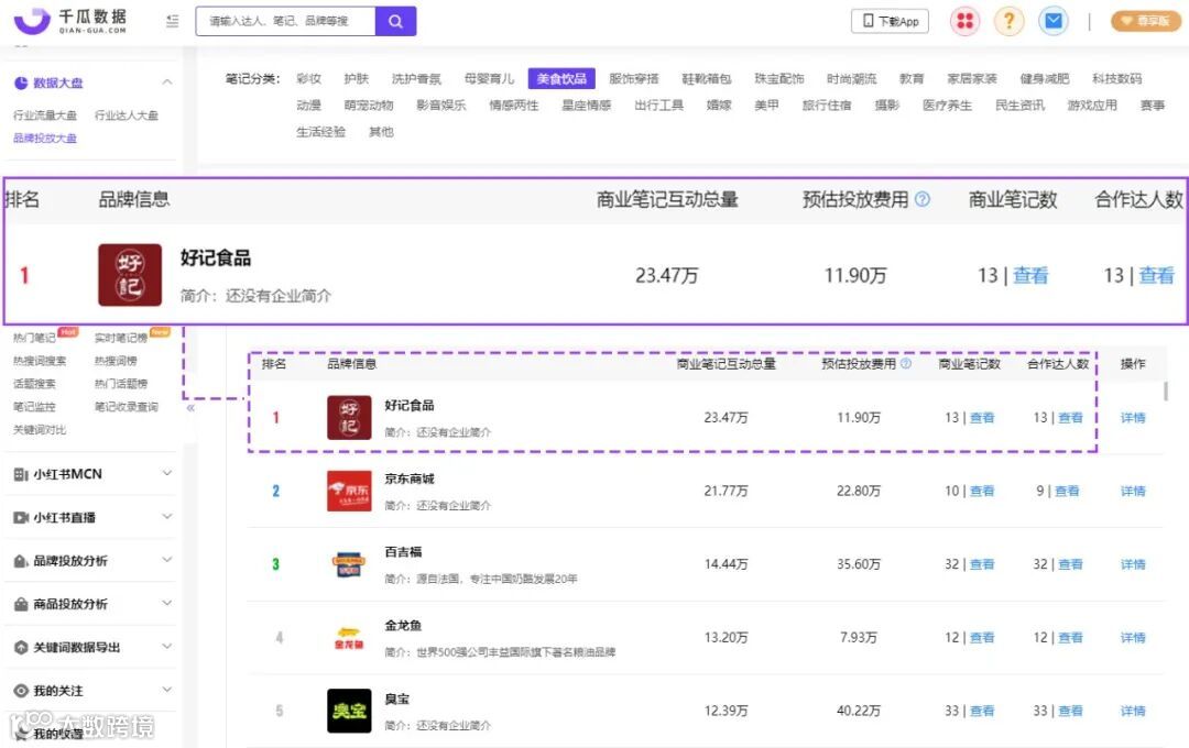 通过千瓜数据品牌投放大盘中的热门品牌排行,找到对标竞品进行分析。内容涉及到商业笔记互动总量、预估投放费用、商业笔记数、合作达人数等,通过详情均可查看。