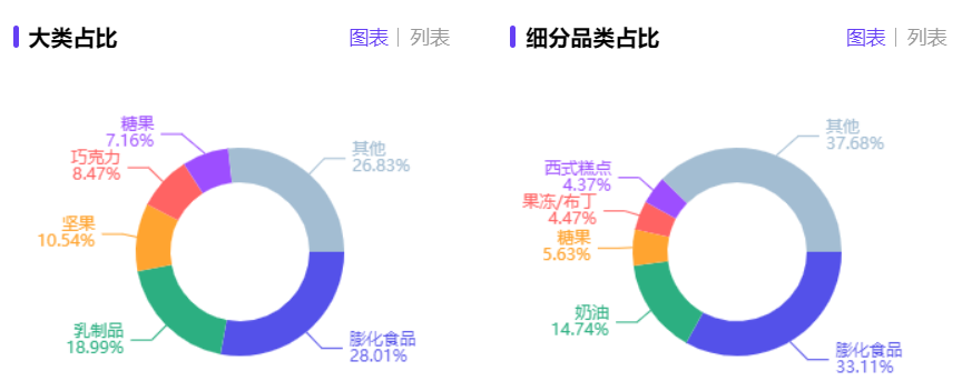 千瓜数据品类分析显示,美食行业中主要的大类占比分为休闲零食、谷物冲泡、粮油干货、酒水饮料、生鲜果蔬五种。例如分析某款巧克力所属品类在小红书中的笔记占比,数据显示该产品在二级分类休闲零食中占比8.42%。可见,巧克力在小红书笔记量不多,拥有着待继续发掘的蓝海市场。