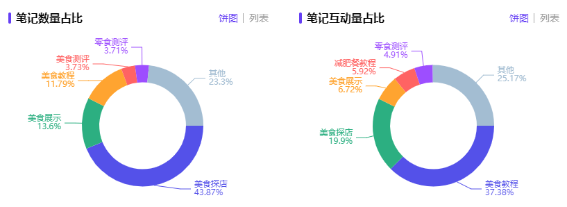 例如针对带关键字“美食”的相关笔记分析,千瓜数据显示近30天内,包含关键字“美食”的笔记类型占比中排名第一的是“美食探店”,占比46.57%;排名第二的为“美食展示”,占比13.59%;第三名“美食教程”占比7.38%,而笔记互动量占比中,“美食教程”占比37.4%,“美食探店”为19.88%,“美食展示”为6.72%,可见,“美食教程”的笔记数量相较之下较少,但是从互动量来看,用户对于这部分的类型关注度更高。品牌后续投放中可以侧重对于这部分内容的布局。