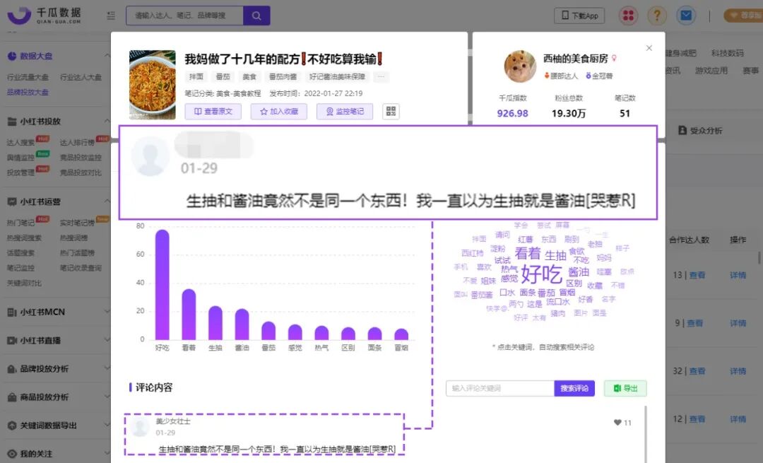 从评论热词TOP10可以看到,用户除了对食物表现出的强烈兴趣外,评论热词“生抽”和“酱油”也以第三和第四的高频出现率居于热词榜前列,并且因为“生抽是不是酱油”的问题引发了网友的一番讨论,可见,达人的种草成功地触达到用户,引起了用户的兴趣。