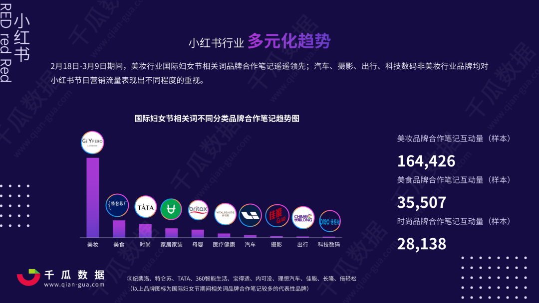 特仑苏、360智能生活 和 理想汽车 等非美妆行业品牌对小红书国际妇女节营销节点均表现出不同程度的重视,一方面是小红书行业 多元化趋势 成为市场共识,另一方面是大部分品牌进入 多个社交媒介平台 投放阶段的标志。