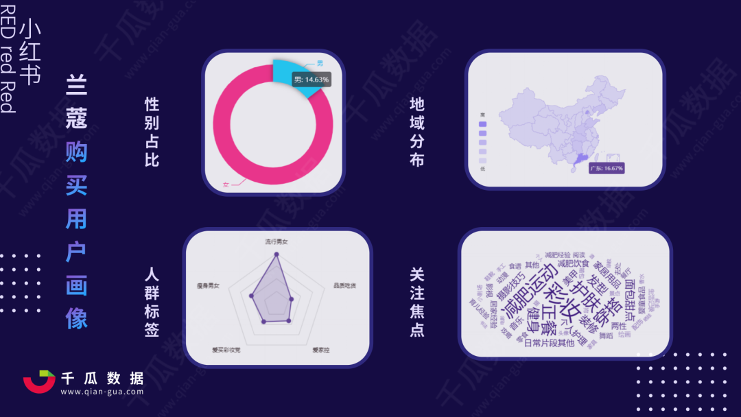 美妆品牌兰蔻 购买用户画像 显示:女性占比 85.37% , 16.67% 的购买用户来自广东省,以 流行男女 为主,普遍关注 彩妆、护肤、减肥运动、正餐 和 穿搭 等,属于 典型的小红书主流用户特征 。