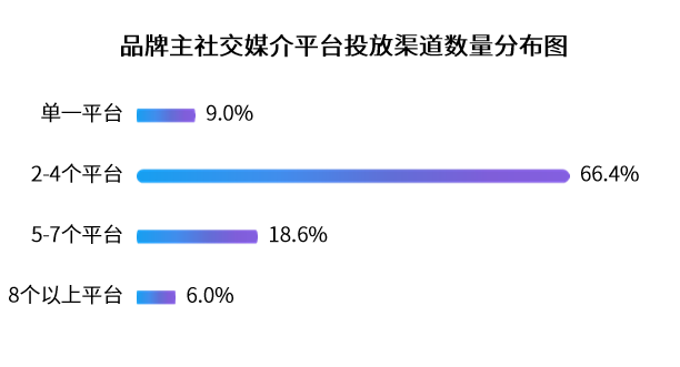 数据显示(截止2020年10月),品牌商家社交媒体单一平台投放占比为 9.0% ,2-4个平台投放占比 66.4% ,8个以上平台投放占比 6.0% 。