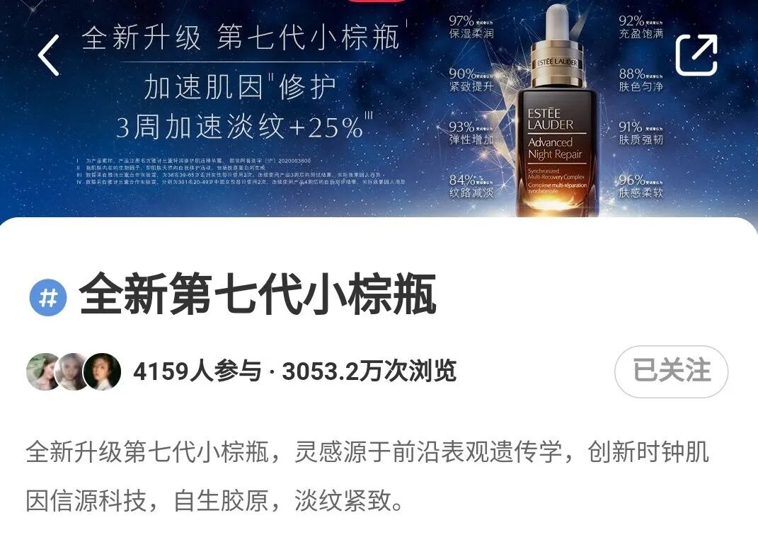 品牌话题是对精准流量进行留存和充分利用小红书长尾流量有效方式。“全新第七代小棕瓶”品牌话题相关浏览互动量超过 3000万 ,相当于小红书用户总量的 十分之一 。小红书品牌话题也是 618营销 中不可或缺的一环。