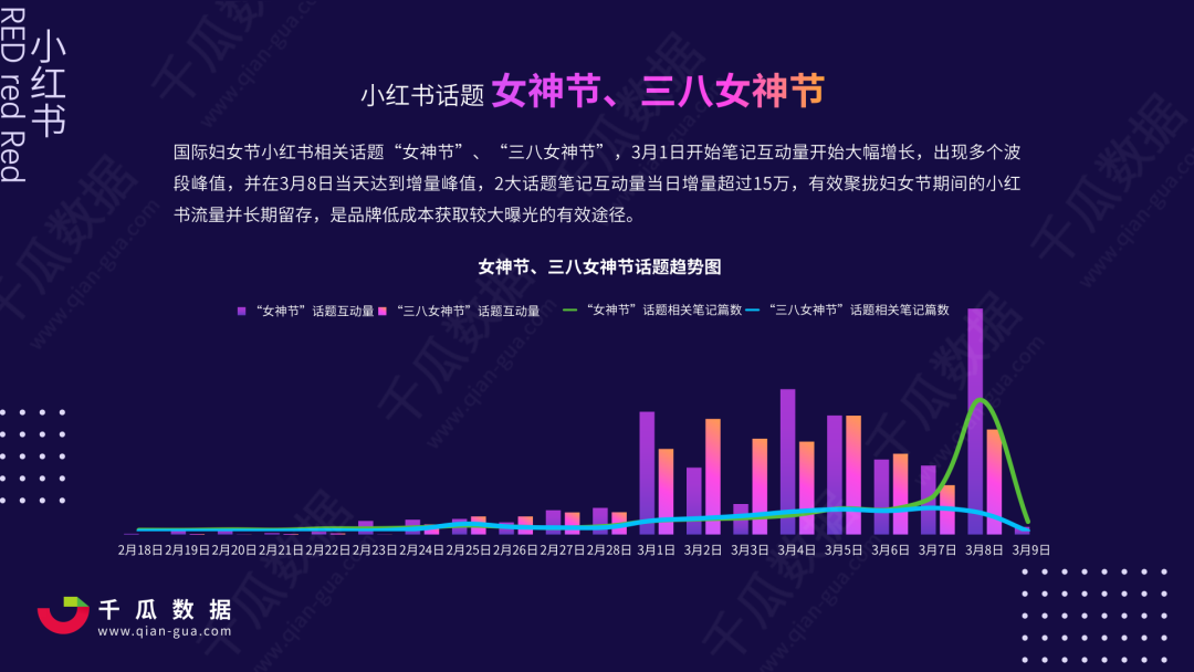 报告显示:小红书用户更关注“女神节”、“女王节”等关键词,对“妇女节” 关键词关注度较低, 传统节日的情感联系削弱,用户注重表达自我,传递价值文化。