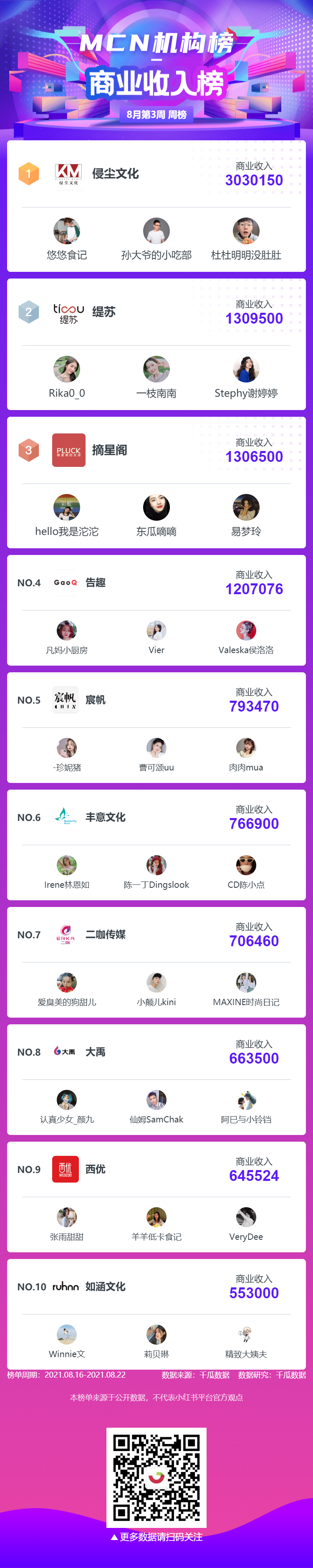 MCN机构榜-商业收入榜中“侵尘文化”排名第一,商业收入3030150;“缇苏”排名第二,商业收入1309500;“摘星阁”排名第三,商业收入1306500。