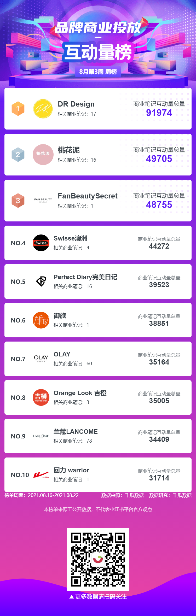 品牌商业投放-互动量榜中“DR Design”排名第一,商业笔记互动量总量91974;“桃花泥”排名第二,商业笔记互动量总量49705;“FanBeautySecret”排名第三,商业笔记互动量总量48755。