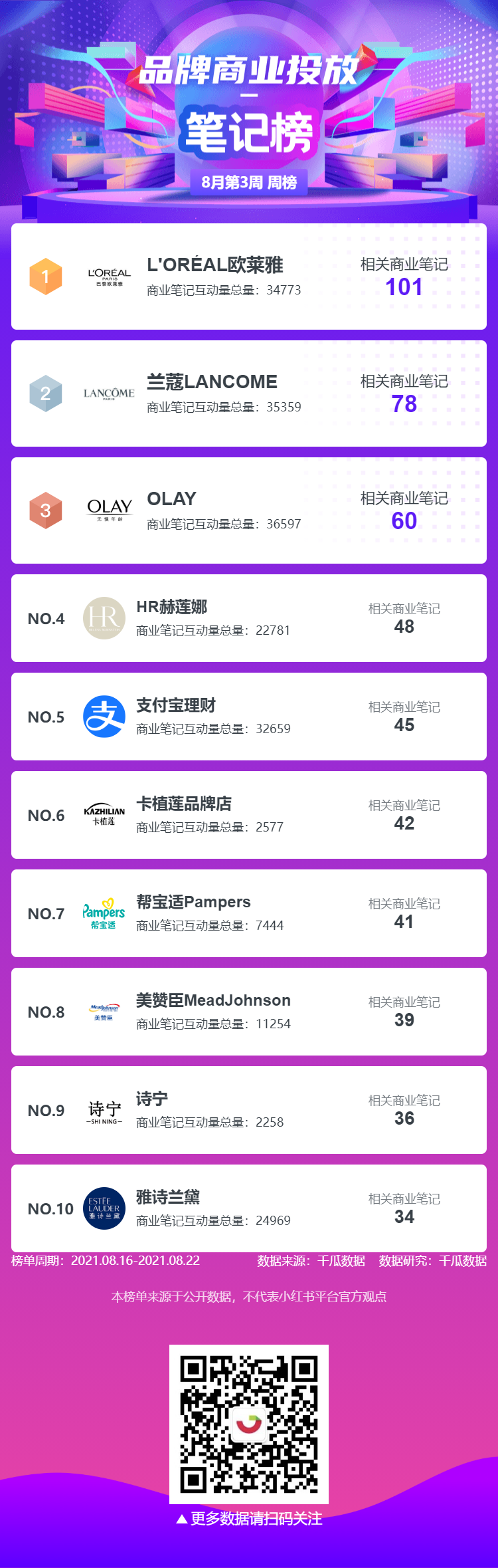 品牌商业投放榜-笔记榜中“欧莱雅”排名第一,相关商业笔记101;“兰蔻”排名第二,相关商业笔记78;“OLAY”排名第三,相关商业笔记60。