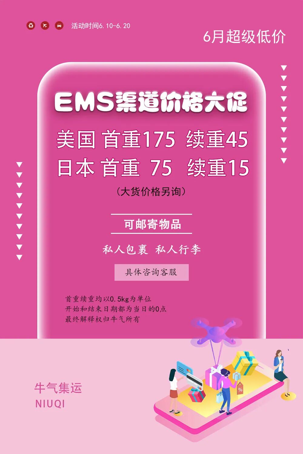 由于前段时间航空成本剧烈波动,因此美线价格尤其昂贵,现在疫情和航空时效均有好转,牛气集运给大家先来一波促销价格~(仅限EMS普货渠道,名牌、液体、粉末、药品不参与。持续时间为6月10日到6月20日)