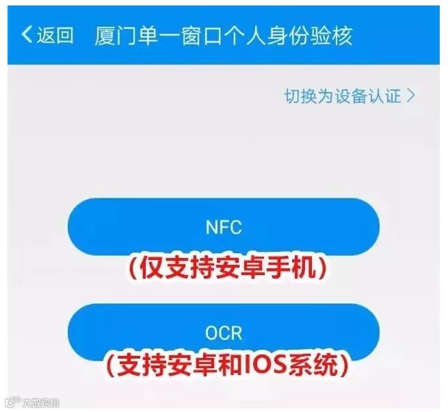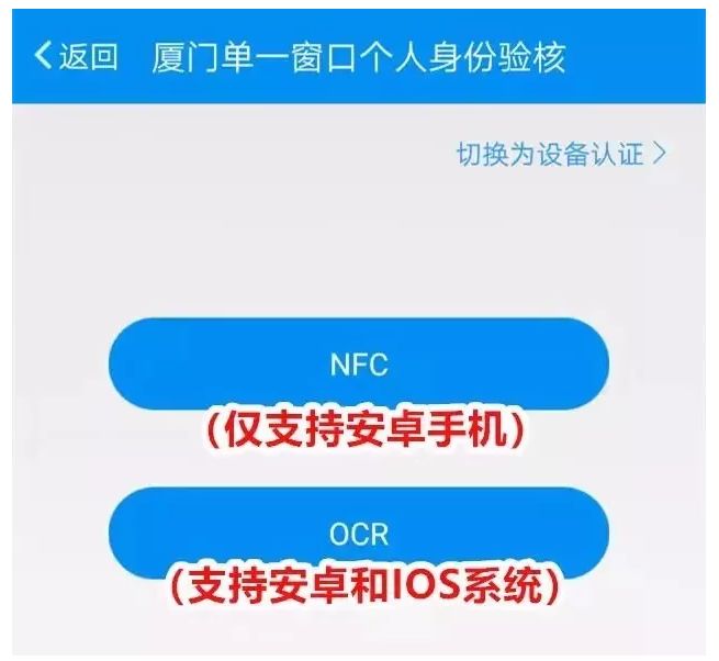 厦门海关贯彻“互联网+海关”理念,应用新兴“黑科技”,创新推出了一个全新的“互联网+身份认证”方式——收件人应用手机APP,通过NFC或者通过外接设备直接读取二代身份证、港澳台居住证原件电子信息,或者利用人脸识别技术比对人脸头像与身份证件原件图片一致后,通过互联网直接传输给海关的身份认证方式。