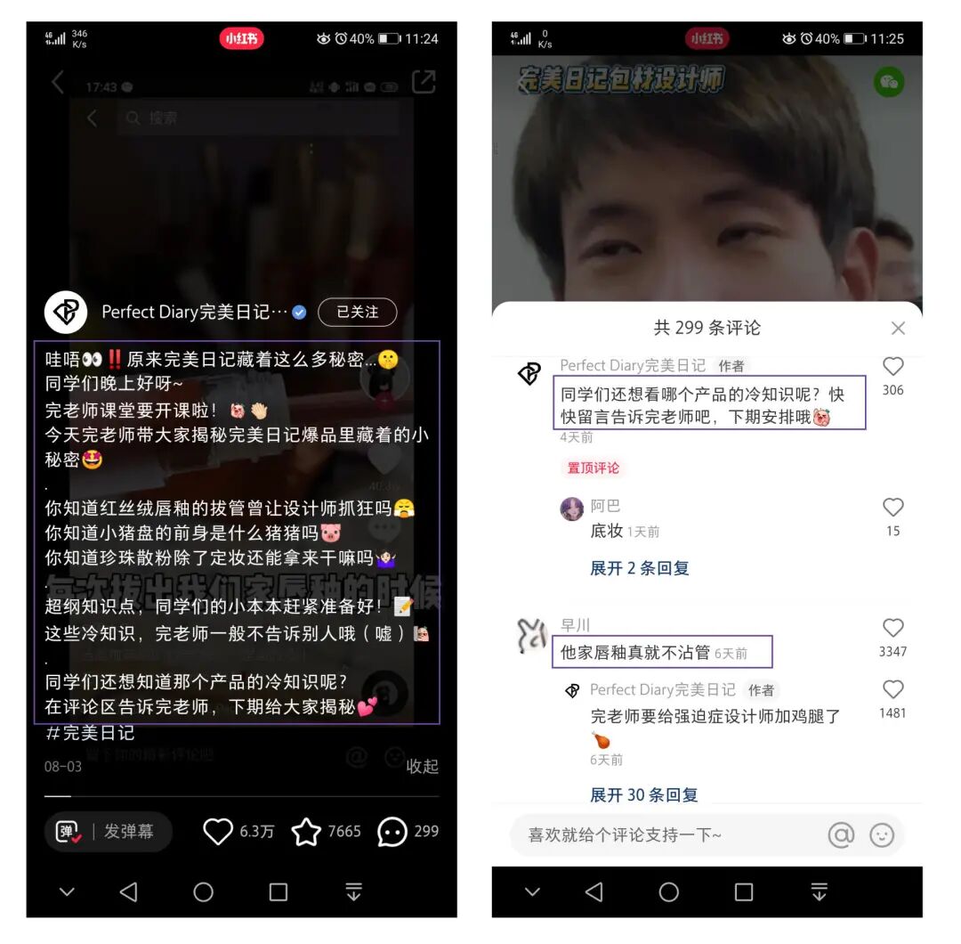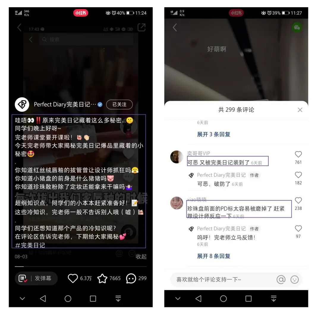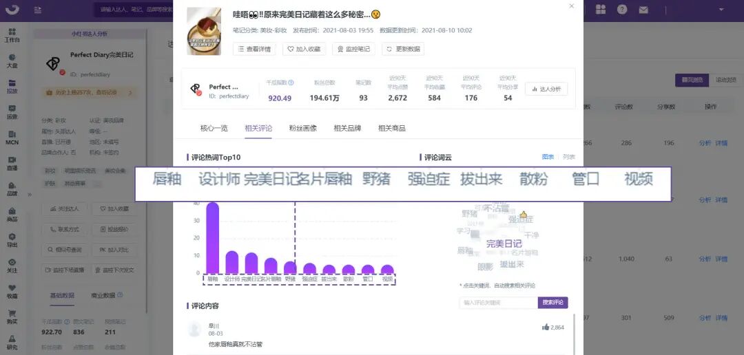 为了避免负面评论占据前列,完美日记也十分重视评论区的维护。引导积极评论强化种草效果,降低消极评论的负面影响。该笔记的评论热词TOP10多为视频中商品相关词,比如唇釉、名片唇釉、野猪(小猪盘)、散粉、管口等等,其中品牌词完美日记位列TOP3。评论词云也未见明显负面词云。