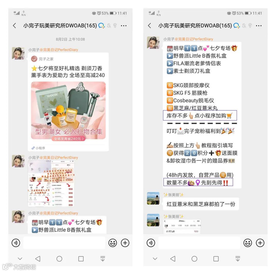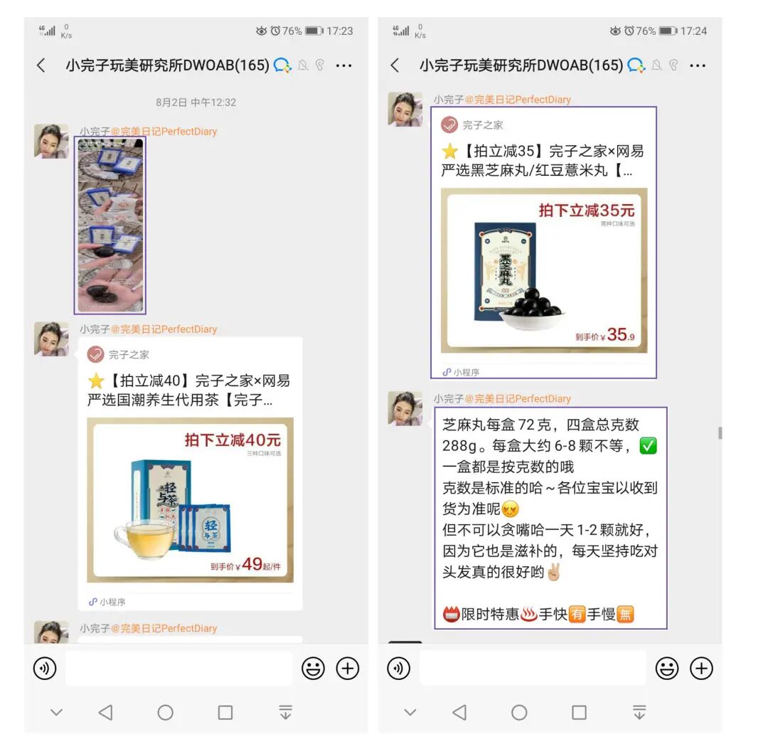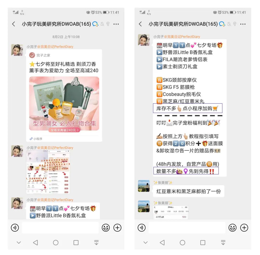 小完子大多在“活跃用户”和普通用户互动结束之后出现。发产品截图和小程序跳转,方便用户进一步了解产品。并以品牌官方身份回复用户问题,再次强调卖点和注意事项,和“限时特惠”制造紧张感,刺激用户形成冲动消费。