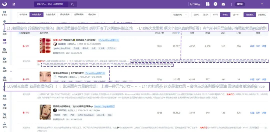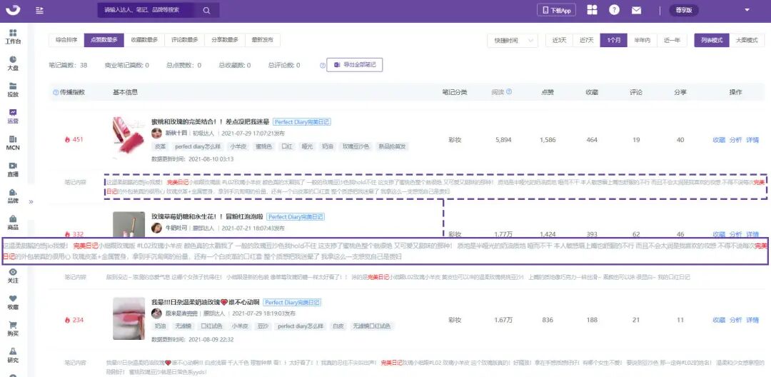 层层递进的产品卖点种草,是为了寻求触达用户的多样化需求。完美日记商业笔记《蜜桃和玫瑰的完美结合!!差点没把我迷晕》从颜色、风格、质地、感受、包装,甚至是拿在手上的体验都一一描述。这篇笔记的阅读仅为其他2篇的三分之一,但是点赞量却是最多的,特别是收藏和分享数将近500,基本上每10人就有1人选择收藏或是分享。