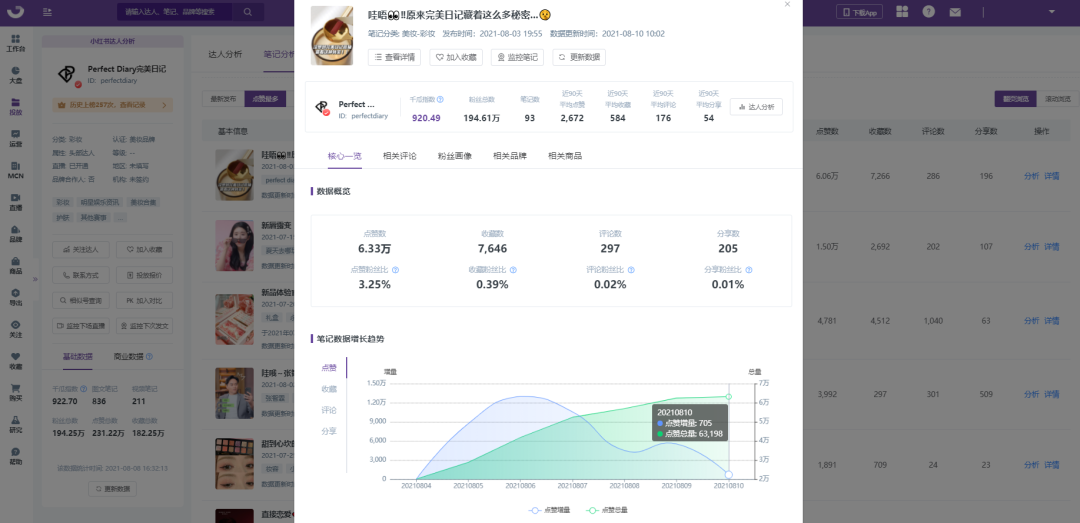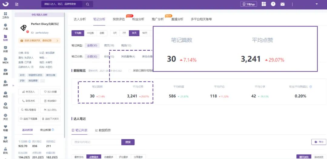 KOL营销+专业号主页优质内容的模式,能够以更低成本持续性的获得较高流量。完美日记作为小红书的资深玩家,品牌账号很早开始就日更笔记。千瓜显示:近30天完美日记更新笔记30篇,平均点赞3241。这样高质量高频率的主页内容无疑可以承接和留存更多的公域流量到私域池。