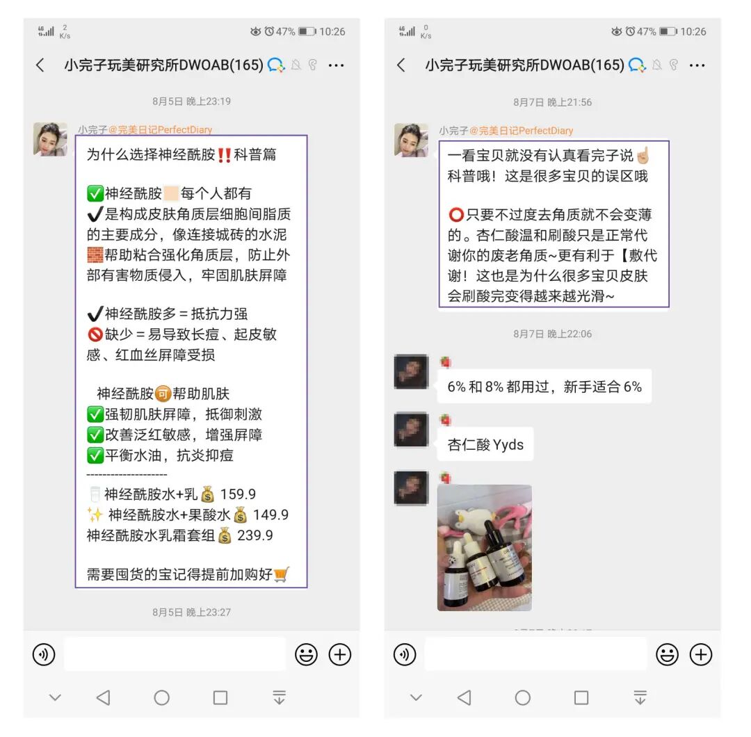 用户问答形式,引出卖点是十分自然且有效方式。这是完美日记私域社群常用的策略。用户先是对产品的价格表达惊讶式疑问,进而引出价格优惠卖点。