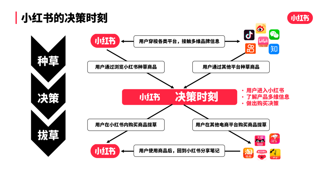 这正是小红书的决策时刻。大部分小红书用户无论是在小红书,还是其他渠道了解到喜欢的产品,都会回到小红书来进行搜索相关笔记,来辅助自己的消费决策。小红书平台成为用户购买前的重要参考。