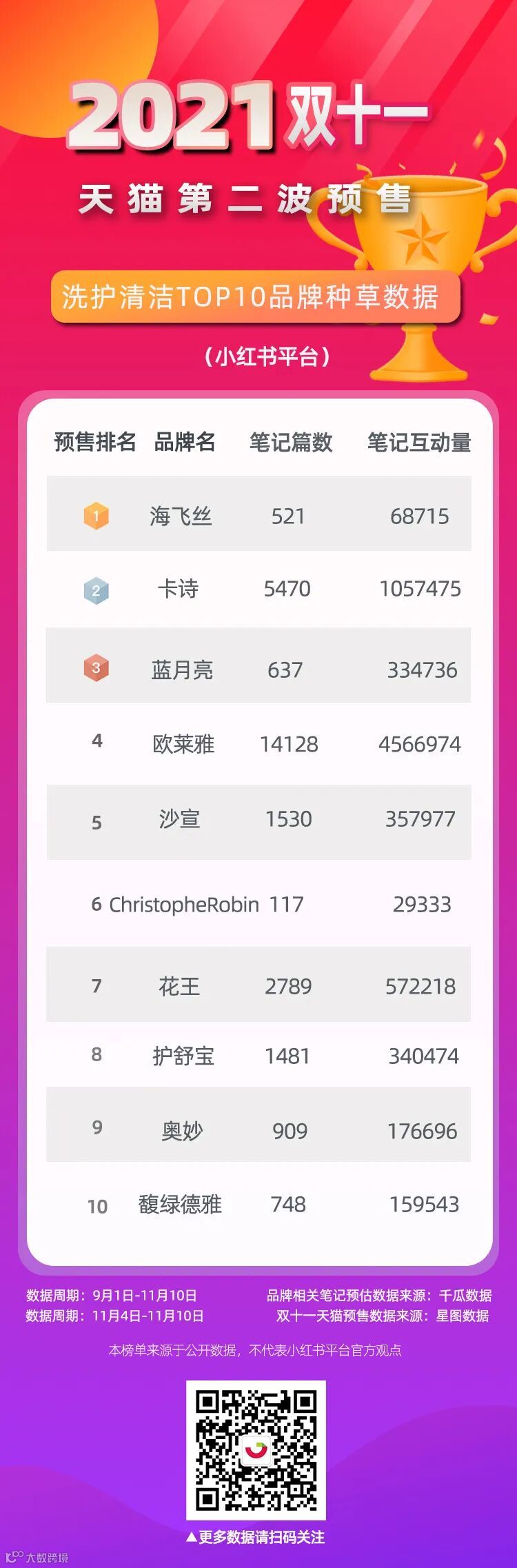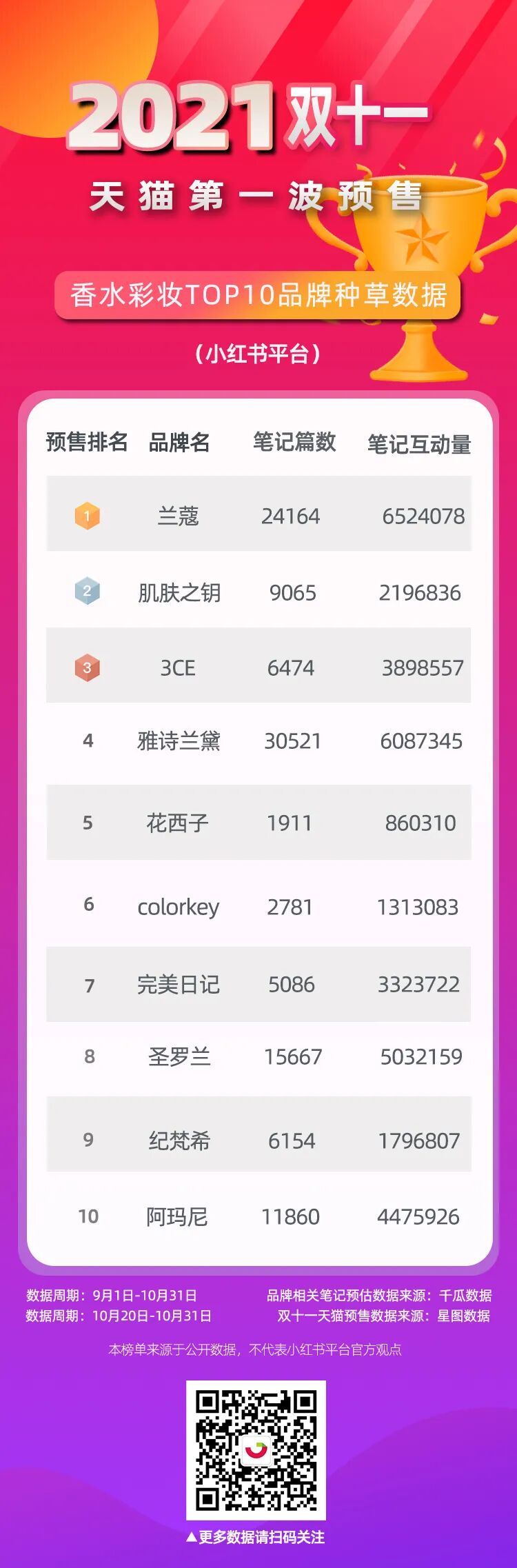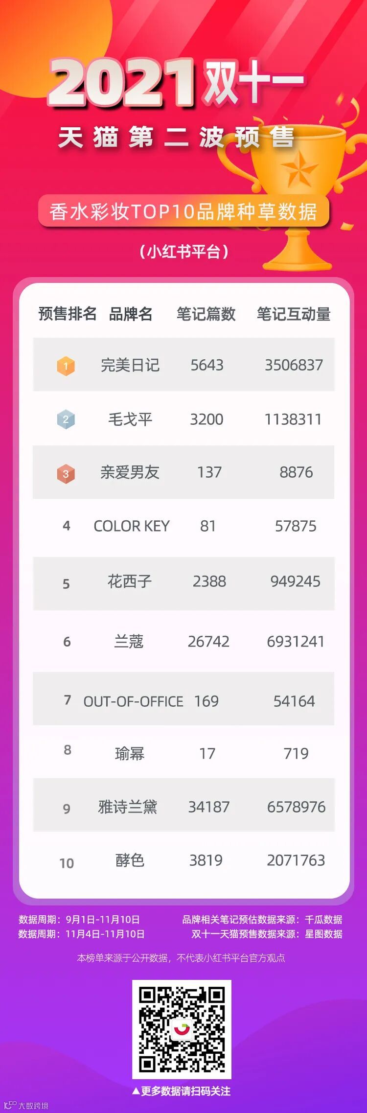 千瓜为大家整理了天猫双十一第一波、第二波预售:美容护肤、香水彩妆、洗护清洁等TOP10品牌的小红书种草数据,供大家参考。