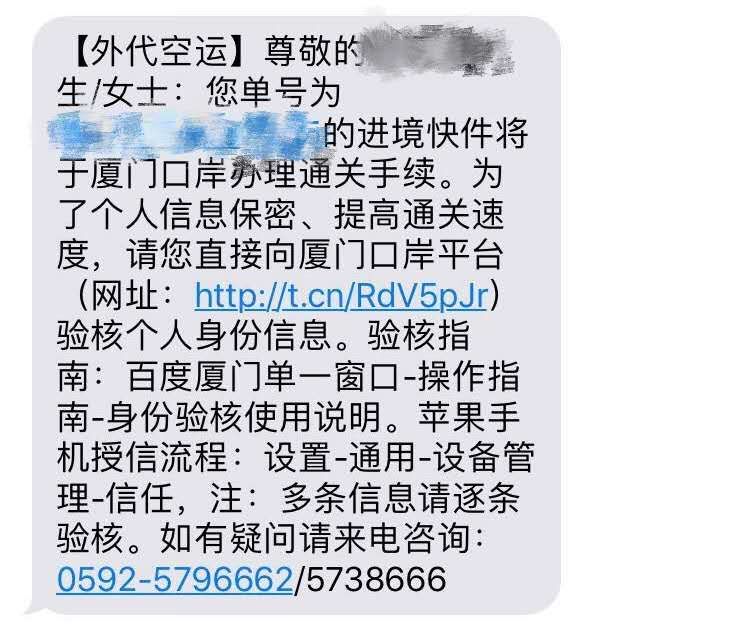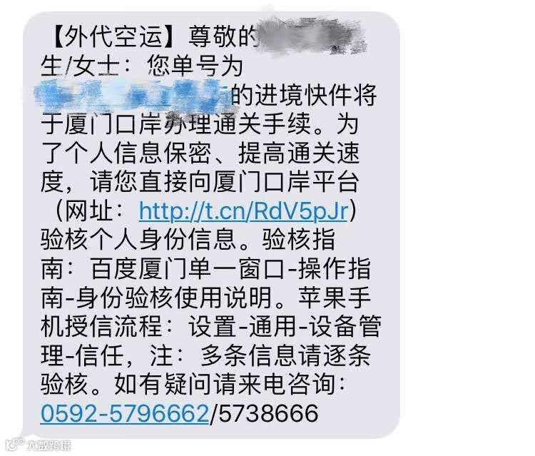 为了您的包裹能及时顺利清关,当收到厦门关口身份验核短信后请尽快按照提示完成验核。此外可以打开链接http://grsfrz.china-xmftz.gov.cn:8080/appDownload/query.action 完成验核或在手机APP搜索个人身份验核这个软件进行身份验证。由此给您带来不便深表歉意,感谢您的理解与支持。