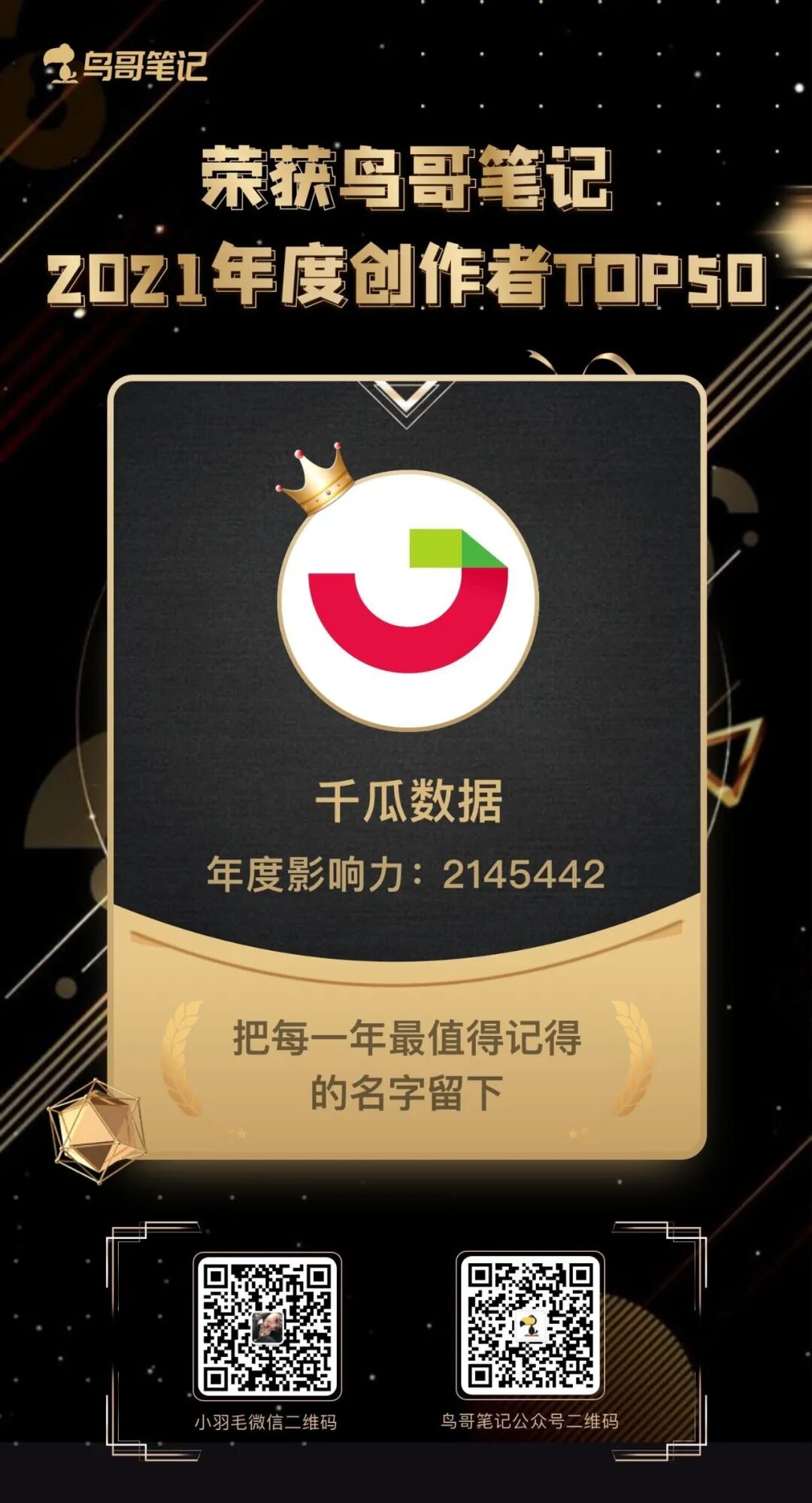 千瓜能够获得2021鸟哥笔记年度创作者TOP50这个奖,离不开过去一年广大用户和平台的认可、支持,非常感谢鸟哥笔记为我们提供这个分享的平台,以此为阵地为用户输出更多干货。