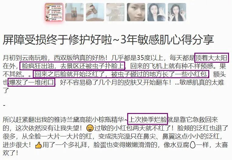 小红书达人@杨花钱 通过一大段文字描述敏感肌在某个特定的场景下产生的皮肤反应,能直接将读者带入情境之中,引起用户共鸣,从而实现产品种草。
