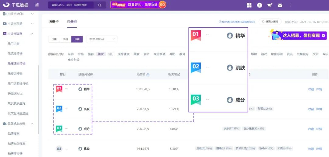 选择总量榜中的长期流量词,搭配产品细分关键词,获得更高的笔记曝光和长尾流量。如美妆热词:精华、肌肤、成分等。
