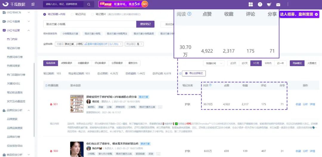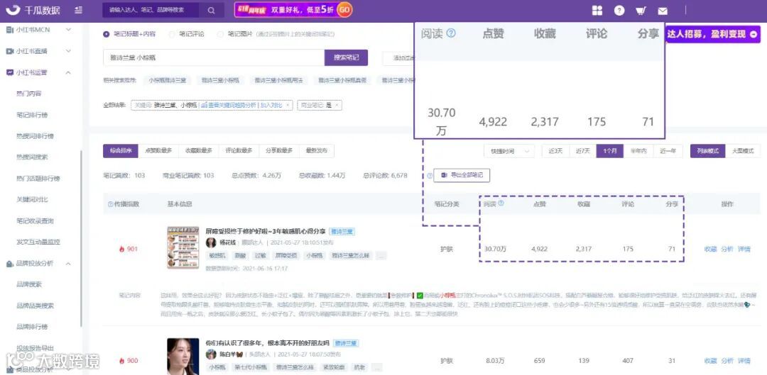 找到品牌竞品品牌或产品,在千瓜数据-小红书运营-热门内容中搜索关键词,如:雅诗兰黛 小棕瓶,选择查看商业笔记,排名第一的笔记为腰部达人@杨花钱 发布的品牌合作笔记,阅读数为30.7万,互动总量超7000,远超排名第二的头部达人。