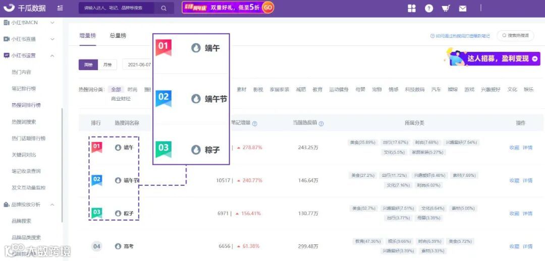 通过千瓜数据-热搜词排行榜选择和产品分类、笔记内容相匹配的小红书热词,选取增量榜中处于上升期的热搜词 ,捕捉当下价值最高的细分流量,如端午节、粽子、夏季防晒、美白等。