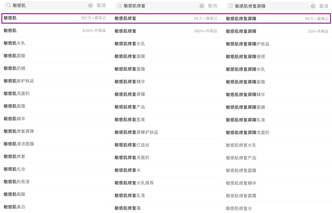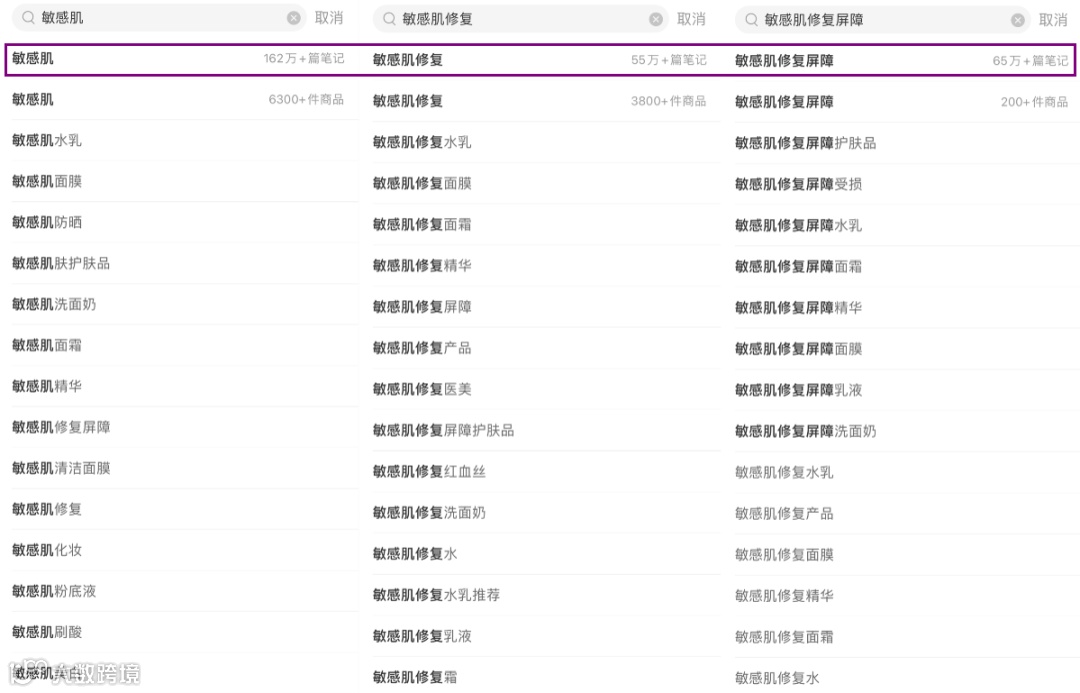 如小红书达人@杨花钱 发布的这篇笔记,在小红书搜索发现,"敏感肌"相关笔记有162万+篇笔记,竞争激烈,排名靠前难度大。而“敏感肌修复”相关笔记有55万+篇笔记,“敏感肌修复屏障”有65万+篇笔记,难度相对较小。