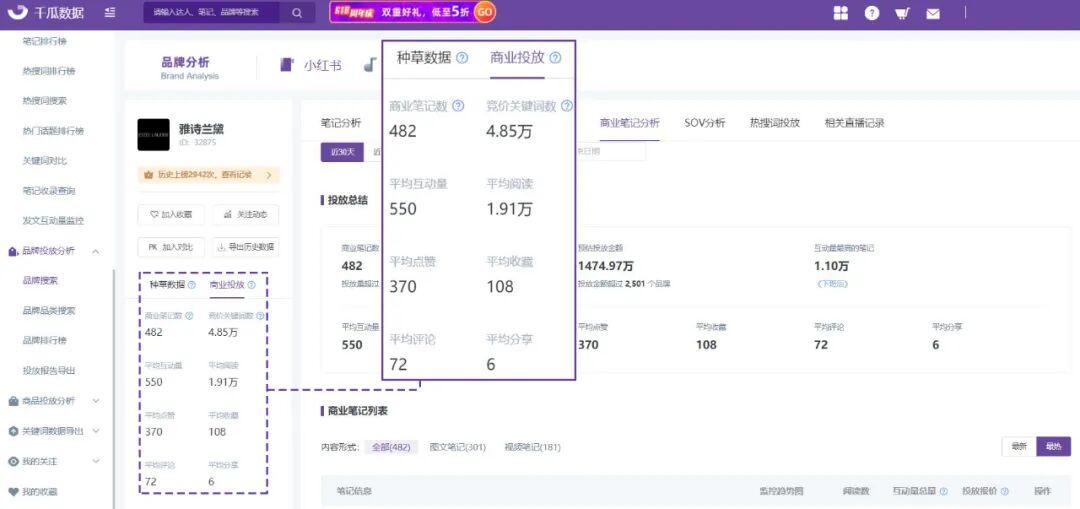 此外,品牌商业笔记分析也做了更新优化,投放总览中增加了平均分享数据,能更加全面了解竞品在小红书平台商业投放的影响力。