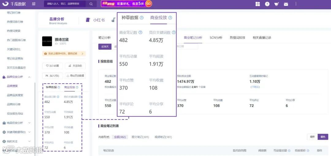 为了更方便品牌用户使用,做好竞品调研,千瓜数据更新了品牌分析,在品牌数据概览处新增了数据切换功能,分为【种草数据】与【商业投放】两个版块,用户可以随时切换查看品牌在小红书的投放数据。