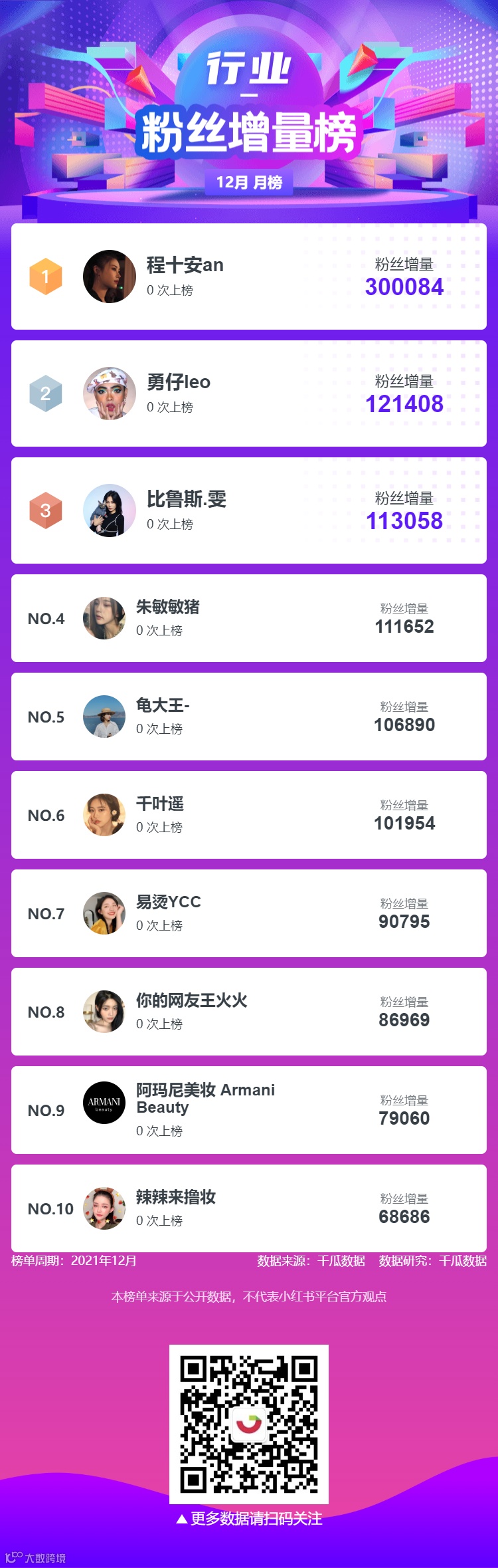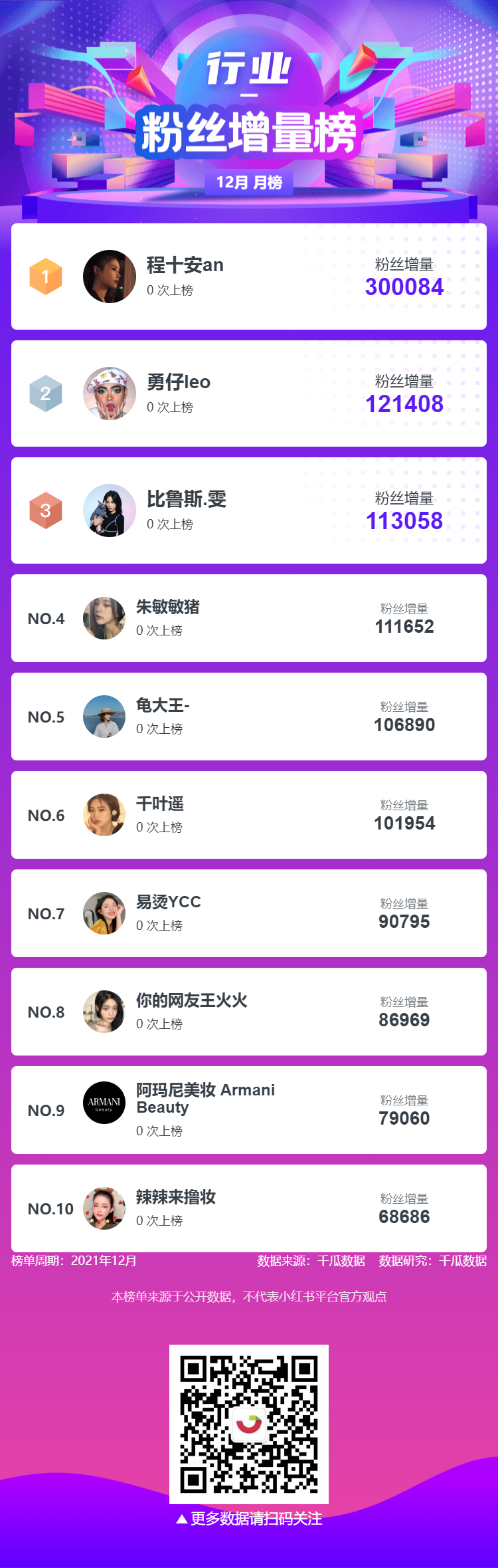 彩妆行业-粉丝增量榜中“程十安an”排名第一,粉丝增量300084;“勇仔leo”排名第二,粉丝增量121408;“比鲁斯·雯”排名第三,粉丝增量113058。