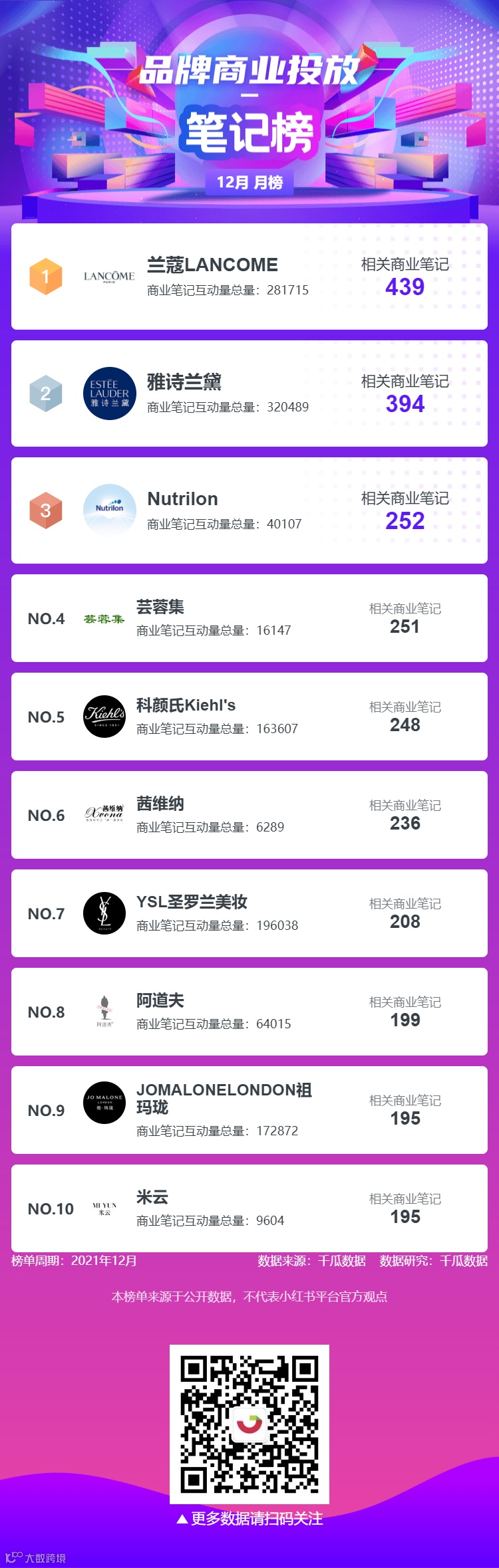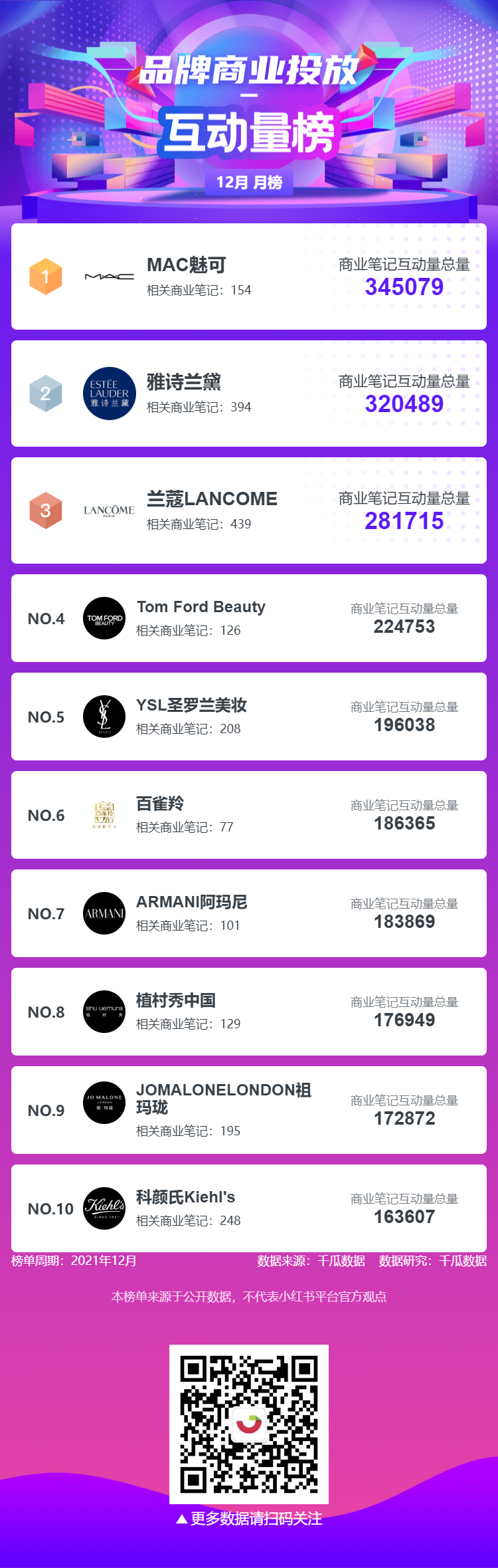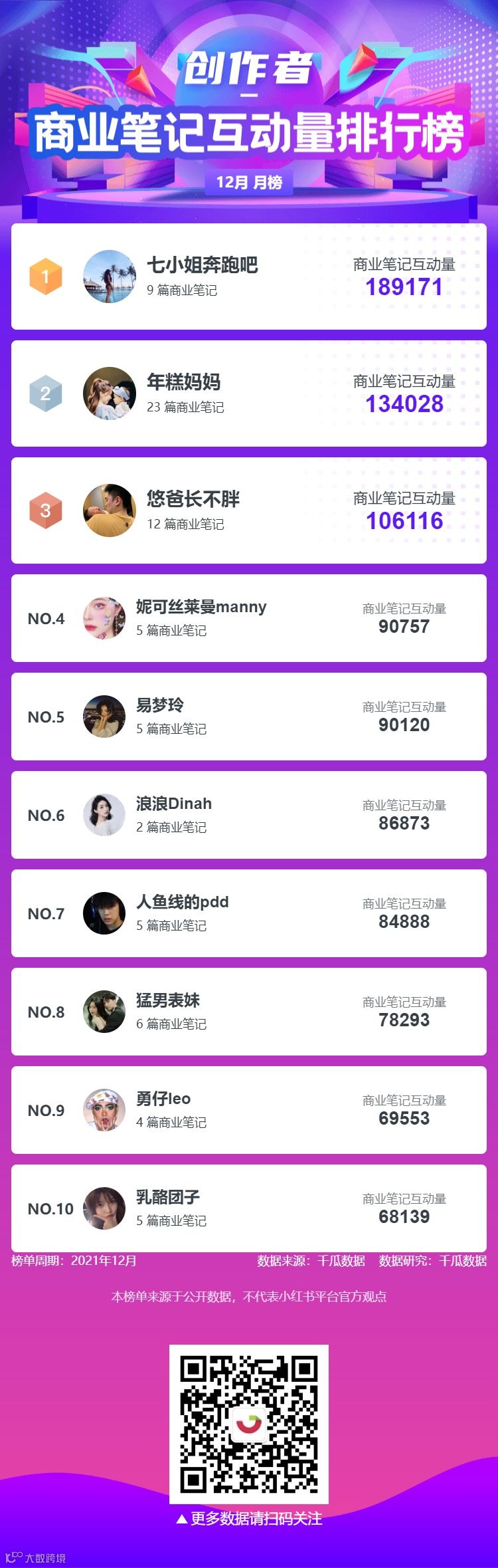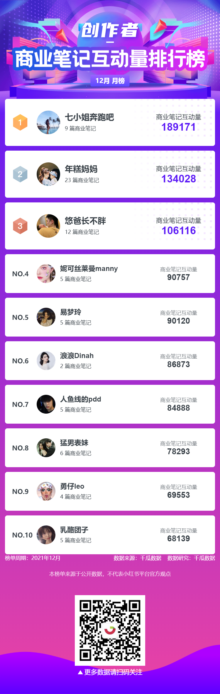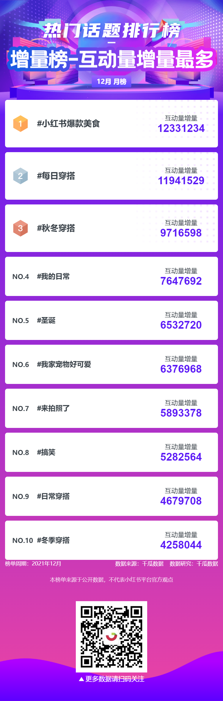 千瓜为大家整理了12月六大榜单月榜(小红书平台),千瓜涨粉红人榜、品牌商业投放榜-笔记榜、品牌商业投放-互动量榜、创作者-商业笔记互动量排行榜、行业-粉丝增量榜、热门话题排行榜,为大家提供小红书多方位的数据参考。