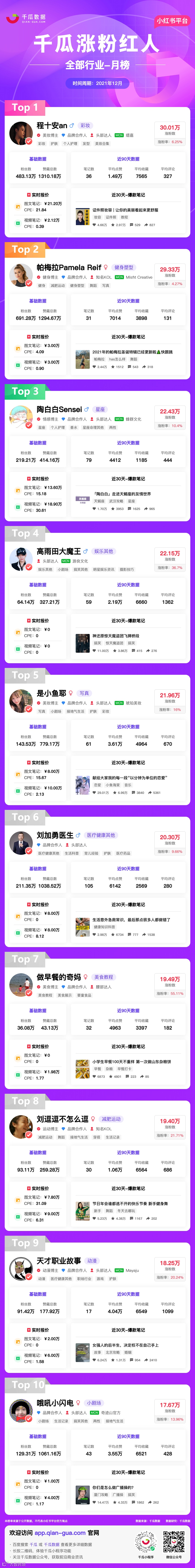 小红书涨粉红人-全部行业中“程十安an”排名第一,涨粉数30.01万;“帕梅拉Pamela Reif”排名第二,涨粉数29.33万;“淘白白Sensei”排名第三,涨粉数31.23万。