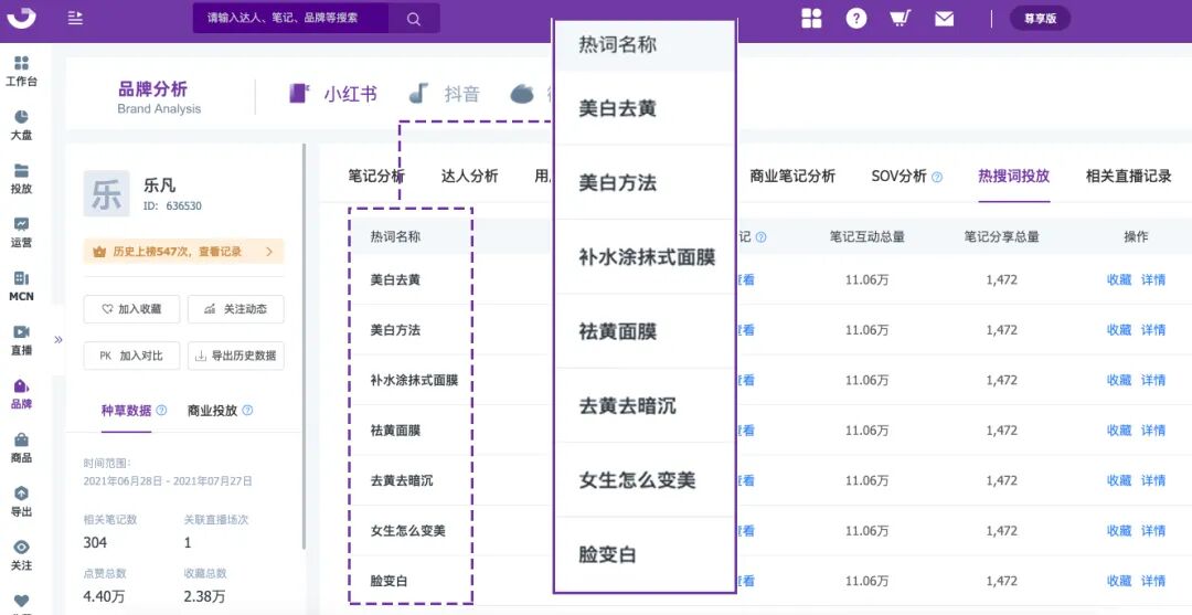 千瓜数据显示,科颜氏在近30天投放了多个产品功效类热搜词,抓住了现在许多用户护肤的痛点“淡斑、补水、美白”,布局品类+功效组合的热搜词,放大产品的卖点,使用户产生共鸣。