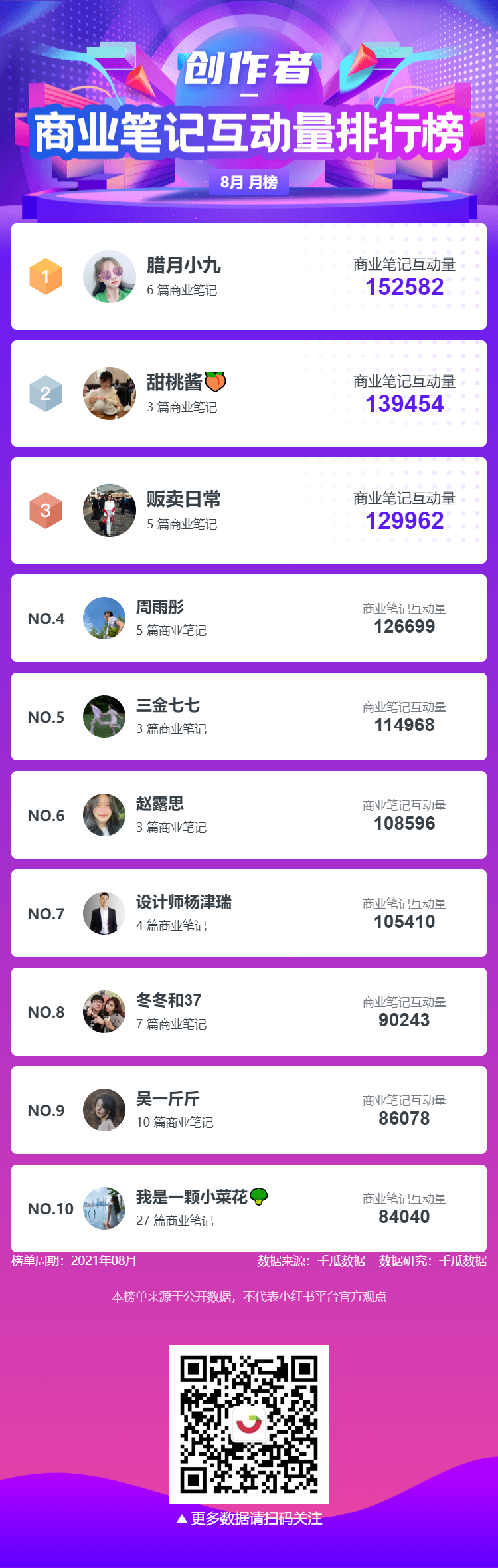 创作者-商业笔记互动量排行榜中“腊月小九”排名第一,商业笔记互动量152582;“甜桃酱”排名第二,商业笔记互动量139454;“贩卖日常”排名第三,商业笔记互动量129962。