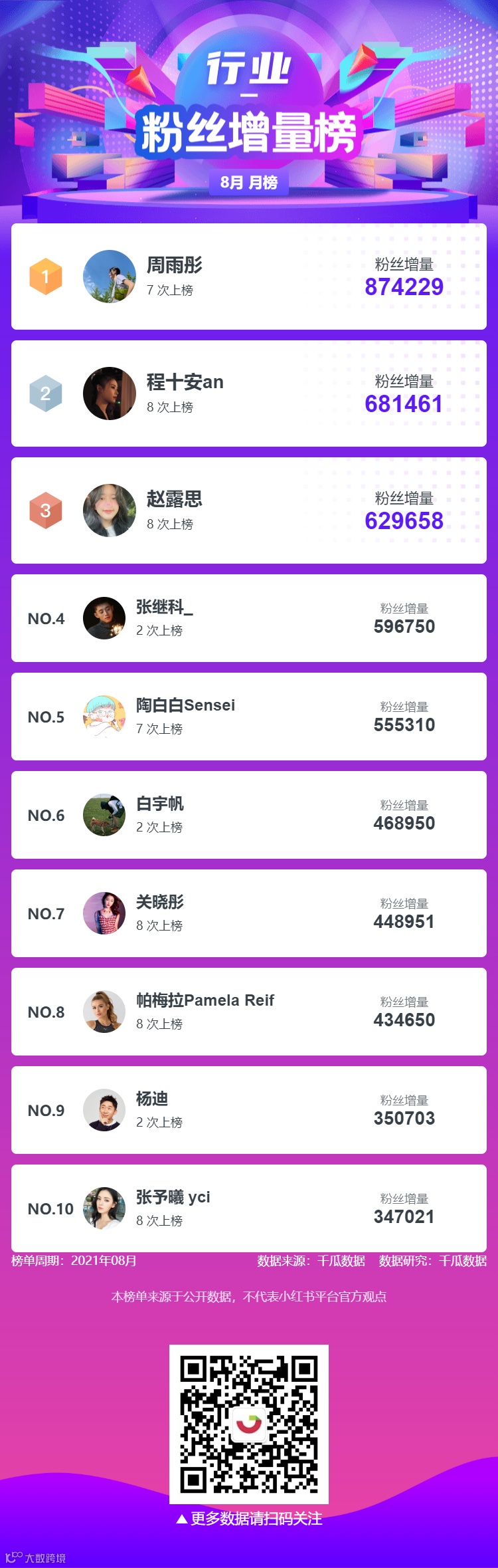 行业-粉丝增量榜中“周雨彤”排名第一,粉丝增量874229;“程十安an”排名第二,粉丝增量681461;“赵露思”排名第三,粉丝增量629658。