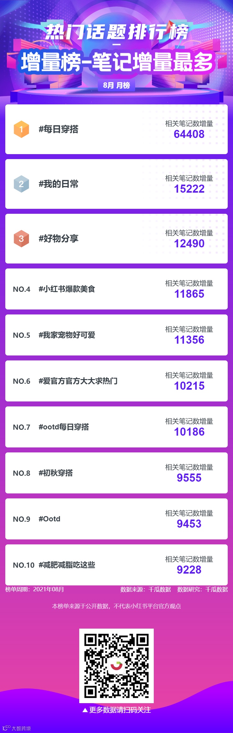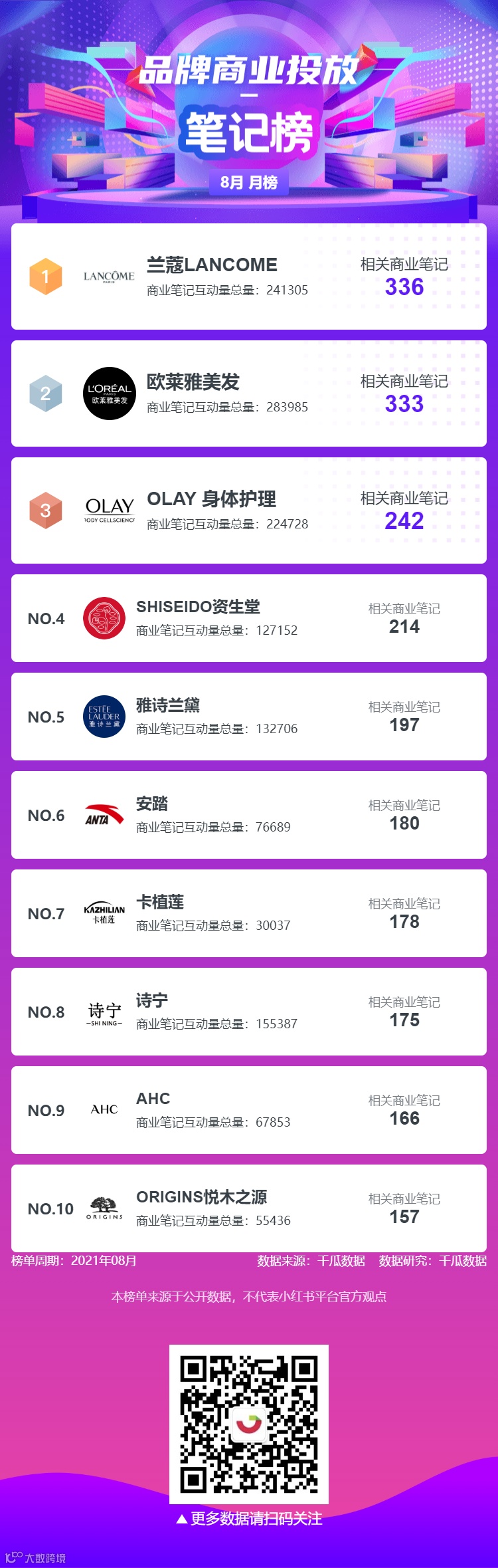 千瓜为大家整理了8月五大榜单月榜(小红书平台),品牌商业投放榜-笔记榜、品牌商业投放-互动量榜、创作者-商业笔记互动量排行榜、热门话题排行榜、行业-粉丝增量榜,为大家提供小红书多方位的数据参考。