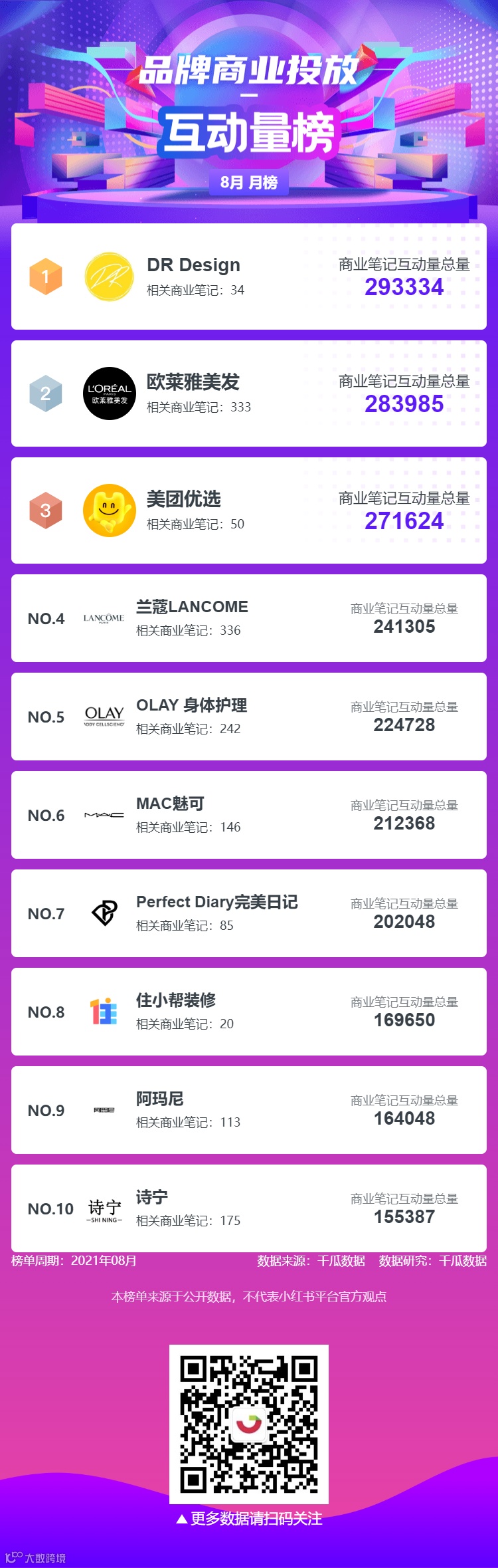 品牌商业投放-互动量榜中“DR Design”排名第一,商业笔记互动量总量293334;“欧莱雅美发”排名第二,商业笔记互动量总量283985;“美团优选”排名第三,商业笔记互动量总量271624。