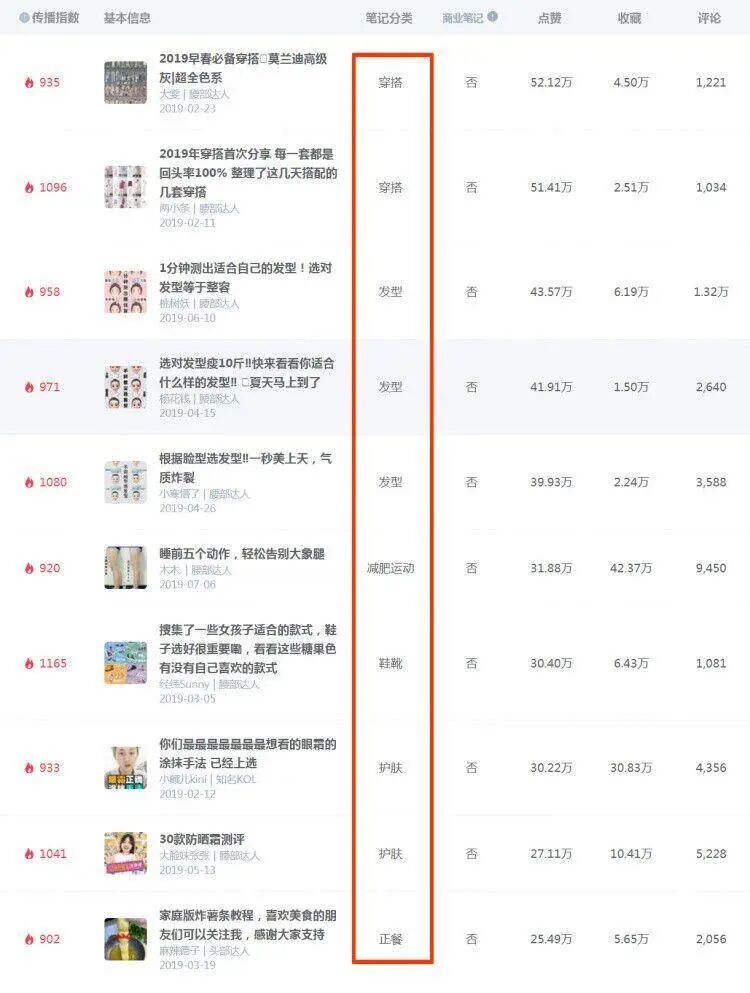 从2019年全年的热门笔记可以看出,排名前10的内容就集中在 “穿搭”、“发型”、“护肤” 等品类,声量表现大多在30~50万上下。