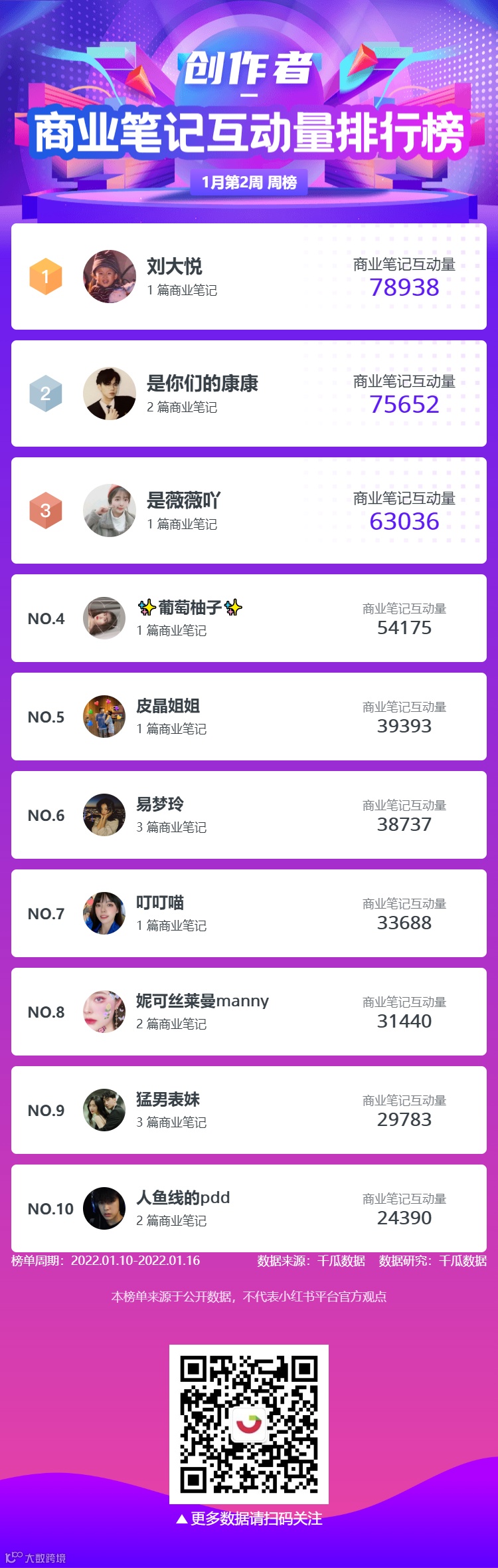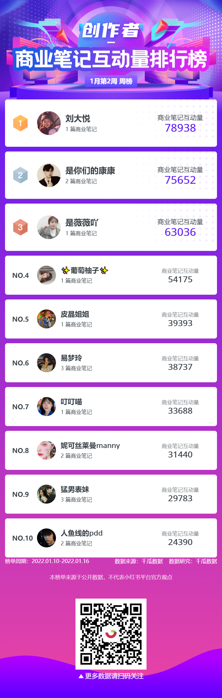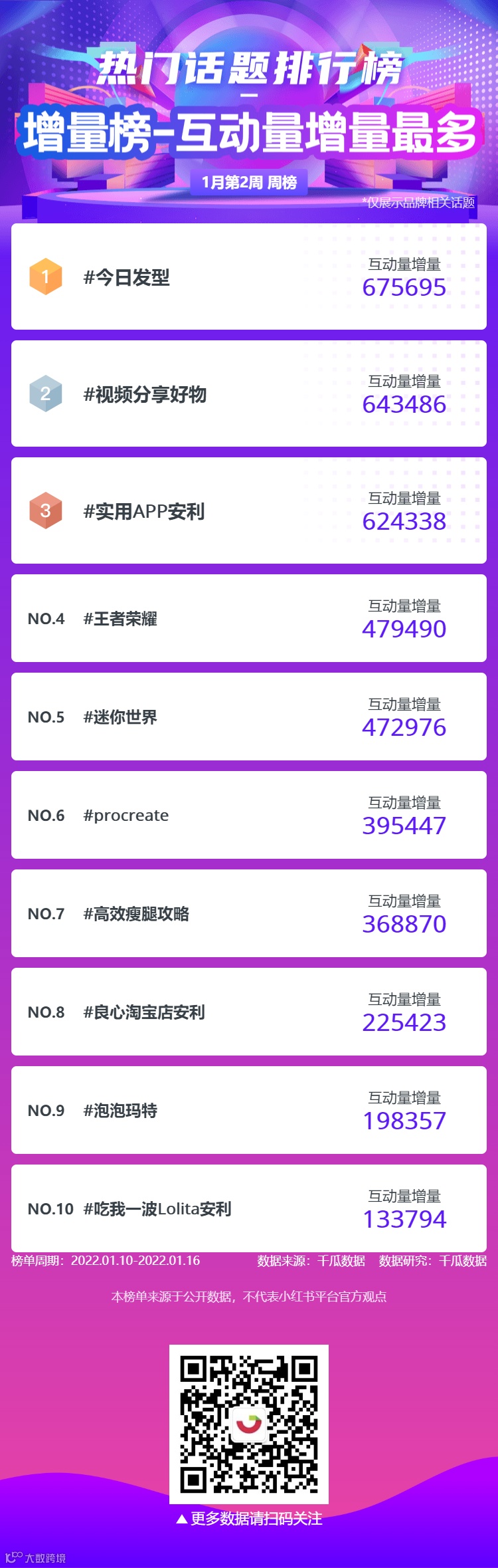 千瓜为大家整理了1月第2周六大榜单周榜(小红书平台),千瓜涨粉红人榜、品牌商业投放榜-笔记榜、品牌商业投放-互动量榜、创作者-商业笔记互动量排行榜、行业-粉丝增量榜、热门话题排行榜,为大家提供小红书多方位的数据参考。